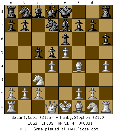 Last move : 0-1 2016 January 29 0:54:16 [Event "FICGS__CHESS__RAPID_M__000081"] [Site "FICGS"] [Date "2015.11.19"] [Round "1"] [White "Basant,Neel"] [Black "Hamby,Stephen"] [Result "0-1"] [WhiteElo "2135"] [BlackElo "2170"] 1.e4 e6 2.d4 d5 3.Nc3 Nf6 4.Bg5 Be7 5.e5 Nfd7 6.h4 h6 7.Bf4 c5 0-1 This chess game has been lost on time (started : 2015.11.19 20:49:31) French : Albin-Alekhine-Chatard attack Player Black won this chess game. Follow this game move after move (download)Chess is a more highly symbolic game, but the aggressions are therefore even more frankly represented in the play. It probably began as a war game; that is, the representation of a miniature battle between the forces of two kingdoms. (Karl Meninger) Dieses schreckliche Gefühl, dass ich gegen eine Maschine spielte, die niemals Fehler macht, zerschmetterte meinen Widerstand. (Mark Taimanov) No hay otro maestro que tenga una voluntad terrífica de ganar. Al tablero, el irradía peligro y aún los oponentes mas fuertes tienden a congelarse como liebres cuando olfatean a una pantera. Aún sus debilidades son peligrosas. Con las blancas, su juego de apertura es predecible - te es posible hacer planes en su contra - pero es tan fuerte que tus planes casi nunca funcionan. En el juego medio, su precisión e invención son fabulosas y en finales, tú simplemente no le puedes vencer. (Experto Alemán anónimo) Je menace de comprendre la position. (Anonyme) The quality of decision is like the well-timed swoop of a falcon which enables it to strike and destroy its victim. (Sun Tzu)