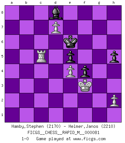 Last move : 1-0 2016 June 6 5:4:43 [Event "FICGS__CHESS__RAPID_M__000081"] [Site "FICGS"] [Date "2015.11.19"] [Round "1"] [White "Hamby,Stephen"] [Black "Helmer,Janos"] [Result "1-0"] [WhiteElo "2170"] [BlackElo "2210"] 1.d4 Nf6 2.c4 g6 3.Nc3 Bg7 4.e4 d6 5.Nf3 O-O 6.Be2 e5 7.O-O Nc6 8.d5 Ne7 9.Ne1 Nd7 10.Be3 f5 11.f3 f4 12.Bf2 g5 13.a4 a5 14.Nd3 b6 15.b4 axb4 16.Nxb4 Nf6 17.Nd3 h5 18.Nb5 g4 19.Qd2 gxf3 20.gxf3 Bh3 21.Rfb1 Ne8 22.Kh1 Bf6 23.Qd1 Kh7 24.Bf1 Qc8 25.Nxc7 Nxc7 26.Rxb6 Ne8 27.Rc1 Bxf1 28.Qxf1 Qd8 29.c5 Kh6 30.Rb4 Ng6 31.c6 Qa5 32.Bb6 Qa6 33.a5 Rf7 34.Nb2 Qxf1+ 35.Rxf1 Bd8 36.Nc4 Nh4 37.Rb3 Rg7 38.Bf2 Rg6 39.Ra1 Nc7 40.Rab1 Na6 41.Rg1 Nc7 42.Rxg6+ Kxg6 43.Nxd6 Rxa5 44.Bxh4 Bxh4 45.Nc4 Ra1+ 46.Kg2 Ra2+ 47.Kh3 Bf6 48.Rb7 Rc2 49.Rxc7 Rxc4 50.d6 Rc3 51.Rc8 Kf7 52.c7 Rxf3+ 53.Kg2 Rc3 54.d7 Rxc7 55.Rxc7 Bd8 56.Rc5 Ke6 57.Kf3 1-0 King's Indian : Orthodox, Aronin-Taimanov variation (Yugoslav attack / Mar del Plata variation) Kingside Castling by player Black (move 5) Kingside Castling by player White (move 7) 10 pieces endgame at move 55 : White KRPPP , Black KBPPP WHITE : King + 1 Rook 3 Pawns BLACK : King + 1 Bishop 3 Pawns Player White won this chess game. Follow this game move after move (download)Chess is the art which expresses the science of logic. (Mikhail Botvinnik) Darum geht es im Schach. Einen Tag gibst du deinem Gegner eine Lektion, am nächsten Tag gibt er dir eine. (Robert James Fischer) El Ajedrez detiene a su maestro dentro de sus propios vínculos, encadenando la mente y el cerebro, por lo que la libertad interior del mas fuerte debe sufrir. (Albert Einstein) La menace est plus forte que l'exécution. (Aaron Nimzovitch) Creativity is inventing, experimenting, growing, taking risks, breaking rules, making mistakes, and having fun. (Mary Lou Cook)