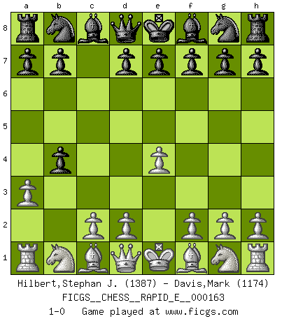 Last move : 1-0 2015 December 28 10:14:24 [Event "FICGS__CHESS__RAPID_E__000163"] [Site "FICGS"] [Date "2015.11.21"] [Round "1"] [White "Hilbert,Stephan J."] [Black "Davis,Mark"] [Result "1-0"] [WhiteElo "1387"] [BlackElo "1174"] 1.e4 c5 2.b4 cxb4 3.a3 1-0 This chess game has been lost on time (started : 2015.11.21 1:46:24) Sicilian : wing gambit, Marshall variation Player White won this chess game. Follow this game move after move (download)I prefer to lose a really good game than to win a bad one. (David Levy) Die Partien sind immer verschieden, die Interviews immer die gleichen. (Garry Kasparov) El Ajedrez es un cuento de Hadas de las 1001 metidas de pata. (Savielly Tartakower) Les ravages du H expliquent la différence de niveau entre Tal et Thal [Abergel]. All art requires courage. (Anne Tucker)