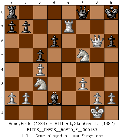 Last move : 1-0 2015 December 3 14:21:33 [Event "FICGS__CHESS__RAPID_E__000163"] [Site "FICGS"] [Date "2015.11.21"] [Round "1"] [White "Hops,Erik"] [Black "Hilbert,Stephan J."] [Result "1-0"] [WhiteElo "1283"] [BlackElo "1387"] 1.e4 e5 2.Nf3 Nf6 3.Nxe5 d6 4.Nf3 Nxe4 5.d4 Nc6 6.Bd3 Nf6 7.O-O Nxd4 8.Nxd4 Be7 9.Re1 O-O 10.c4 Bg4 11.f3 Bh5 12.Nc3 Qd7 13.Bf5 Qd8 14.Bg5 Re8 15.Qd3 Bg6 16.Re3 c5 17.Nc2 h6 18.Bxf6 Bxf6 19.Bxg6 Rxe3 20.Bh7+ Kh8 21.Nxe3 g6 22.Bxg6 fxg6 23.Qxg6 Bg5 24.Nf5 Qf8 25.Re1 Bd2 26.Re7 1-0 Petrov : Classical attack Kingside Castling by player White (move 7) Kingside Castling by player Black (move 9) Player White won this chess game. Follow this game move after move (download)Chess mastery essentially consists of analyzing Chess positions accurately. (Mikhail Botvinnik) Ich habe die besten Aussichten, den ersten Preis zu gewinnen - denn jeder muss gegen Steinitz spielen, nur ich nicht! (Wilhelm Steinitz) Haz el enroque temprano y seguido. (Rob Sillars) L'attaque fait le spectacle, la défense gagne les matchs. (Dicton footballistique) Gambling : The sure way of getting nothing from something. (Wilson Mizner)