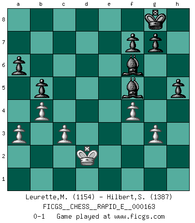 Last move : 0-1 2015 December 20 14:27:50 [Event "FICGS__CHESS__RAPID_E__000163"] [Site "FICGS"] [Date "2015.11.21"] [Round "1"] [White "Leurette,Marc-Antoine"] [Black "Hilbert,Stephan J."] [Result "0-1"] [WhiteElo "1154"] [BlackElo "1387"] 1.e4 e5 2.Nf3 Nf6 3.Nc3 Bc5 4.d4 exd4 5.Nxd4 O-O 6.Be3 b6 7.e5 Nd5 8.Nxd5 Bb7 9.Nc3 Na6 10.Qd2 d6 11.exd6 Bxd6 12.a3 Re8 13.O-O-O Nc5 14.f3 Qf6 15.Bg5 Qe5 16.Bc4 a6 17.Rhe1 Qxh2 18.Rxe8+ Rxe8 19.Re1 Rxe1+ 20.Qxe1 Qe5 21.Qh4 Nd7 22.Bf4 Qxf4+ 23.Qxf4 Bxf4+ 24.Kb1 Ne5 25.Nd5 Bg5 26.Nxc7 Nxc4 27.c3 Ne3 28.g3 Bf6 29.f4 Nd5 30.Nxd5 Bxd5 31.Kc2 h5 32.b4 b5 33.Nf5 Be4+ 34.Kd2 Bxf5 0-1 Petrov Three knights game Kingside Castling by player Black (move 5) Queenside Castling by player White (move 13) Player Black won this chess game. Follow this game move after move (download)The beauty of a move lies not in its' appearance but in the thought behind it. (Siegbert Tarrasch) Um dein Spiel zu verbessern musst du zuallererst das Endspiel studieren, denn diese kann unabhängig studiert werden. Die Eröffnung und das Mittelspiel müssen immer in Bezug gesetzt werden zum Endspiel. (José Raúl Capablanca) Ciertamente el estado mental actual de Bobby Fischer es una tragedia. Uno de los mas grandes jugadores de Ajedrez del mundo -el orgullo y pena del Ajedrez Americano. (Frank Brady) Le profane ne songe pas à la somme de jouissance dont il se prive, qui méconnaît ce jeu aux ressources aussi variées que passionnantes. (Jean-Marie Jeanton-Lamarche) Players are not good because they find tactics, it is about the way to find the positions in which those tactics are hidden. (Luc-Olivier Leclerc)