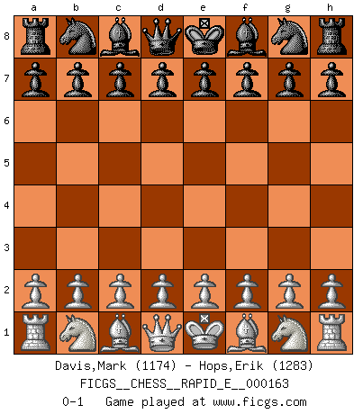 Last move : 0-1 2015 December 21 9:22:37 [Event "FICGS__CHESS__RAPID_E__000163"] [Site "FICGS"] [Date "2015.11.21"] [Round "1"] [White "Davis,Mark"] [Black "Hops,Erik"] [Result "0-1"] [WhiteElo "1174"] [BlackElo "1283"] 0-1 This chess game has been lost on time (started : 2015.11.21 1:46:24) Player Black won this chess game. Follow this game move after move (download)I love all positions. Give me a difficult positional game, I will play it. But totally won positions, I cannot stand them. (Hein Donner) Modernes Schach sorgt sich zuviel um Dinge wie Bauernstruktur usw. Vergessen Sie das, Schachmatt beendet das Spiel! (Nigel Short) Tu eres para mi la Reina en d8 y yo soy el Peón en d7!!. (GM Eduard Gufeld) Le temps de noter son nom sur la feuille de partie, j'étais déjà en zeitnot ! D'un modeste amateur apparié lors de la première ronde d'un open contre le grand-maître Azmaïparashvili. Computers make it easier to do a lot of things, but most of the things they make it easier to do don't need to be done. (Andy Rooney)