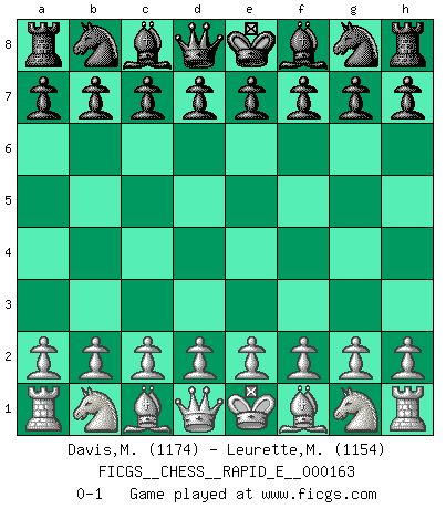 Last move : 0-1 2015 December 21 9:22:37 [Event "FICGS__CHESS__RAPID_E__000163"] [Site "FICGS"] [Date "2015.11.21"] [Round "1"] [White "Davis,Mark"] [Black "Leurette,Marc-Antoine"] [Result "0-1"] [WhiteElo "1174"] [BlackElo "1154"] 0-1 This chess game has been lost on time (started : 2015.11.21 1:46:24) Player Black won this chess game. Follow this game move after move (download)A great player and a great example for many. His book My 60 Memorable Games had a big impact on me. It is a shame he didn't continue to enrich the world of chess with his unparalleled understanding after 1972. (Jan Timman, about Bobby Fischer's death) Ich bin es gewohnt, das die Jugend mir überhaupt keinen Respekt entgegenbringt. (Alexander Morozewich) EL Ajedrez es como la vida. (Boris Spassky) J'ai toujours senti une vague pitié pour l'homme qui ne connaît rien aux échecs, tout comme j'en aurais pour un homme ignorant de l'amour. Les Echecs, comme la musique ou comme l'amour, ont le pouvoir de rendre heureux. (Siegbert Tarrasch) Live, lose, and learn, by observing your opponent how to win. (Amber Steenbock)