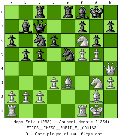 Last move : 1-0 2015 November 30 19:45:10 [Event "FICGS__CHESS__RAPID_E__000163"] [Site "FICGS"] [Date "2015.11.21"] [Round "1"] [White "Hops,Erik"] [Black "Joubert,Hennie"] [Result "1-0"] [WhiteElo "1283"] [BlackElo "1354"] 1.e4 c5 2.Nc3 Nc6 3.g3 e6 4.Bg2 Nf6 5.Nge2 d6 6.O-O Be7 7.d3 a6 8.h3 Qc7 9.Be3 b5 10.f4 Bb7 11.g4 O-O 12.Ng3 Rac8 13.g5 Nd7 14.Qg4 g6 15.f5 exf5 16.exf5 Nde5 17.Qh4 Rfe8 18.Nd5 Bf8 19.Nf6+ 1-0 Sicilian : Closed Kingside Castling by player White (move 6) Kingside Castling by player Black (move 11) Player White won this chess game. Follow this game move after move (download)Later, I began to succeed in decisive games. Perhaps because I realized a very simple truth: not only was I worried, but also my opponent. (Mikhail Tal) Über die Verhaftung Bobby Fischers: Warum es die Bush-Administration für nötig befindet einen 61 Jahre alten Mann zu hetzten, der für niemanden ausser sich selbste eine Gefahr darstellt ist ein Rätsel. (Nigel Short) El Ajedrez es parte de una cultura y si una cultura esta en decadencia, entonces también el Ajedrez declinará. (Mikhail Botvinnik) Karpov est une pièce de musée. (Garry Kasparov) The only sure thing about luck is that it will change. (Wilson Mizner)