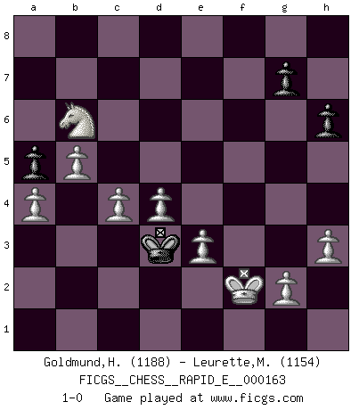 Last move : 1-0 2015 December 16 21:33:27 [Event "FICGS__CHESS__RAPID_E__000163"] [Site "FICGS"] [Date "2015.11.21"] [Round "1"] [White "Goldmund,Heike"] [Black "Leurette,Marc-Antoine"] [Result "1-0"] [WhiteElo "1188"] [BlackElo "1154"] 1.b4 e5 2.Bb2 d6 3.e3 Nf6 4.c4 b6 5.Nf3 c5 6.b5 Bg4 7.Be2 Nbd7 8.O-O a5 9.a4 Be7 10.d3 O-O 11.Nbd2 d5 12.Nxe5 Bxe2 13.Qxe2 Nxe5 14.Bxe5 d4 15.exd4 cxd4 16.Nf3 Bd6 17.Bxd4 Bc5 18.Bxc5 Re8 19.Be3 Qd6 20.d4 Ng4 21.Rad1 Nxe3 22.fxe3 h6 23.Ne5 Kh7 24.Rxf7 Rf8 25.Rdf1 Rxf7 26.Nxf7 Qg6 27.Ne5 Qe6 28.Qd3+ Kg8 29.Qe4 Rf8 30.Rxf8+ Kxf8 31.Ng6+ Kf7 32.Qxe6+ Kxe6 33.Nf4+ Kf6 34.Nd5+ Kf5 35.h3 Ke4 36.Kf2 Kd3 37.Nxb6 1-0 Polish (Sokolsky) opening Kingside Castling by player White (move 8) Kingside Castling by player Black (move 10) Player White won this chess game. Follow this game move after move (download)Chess teaches you to control the initial excitement you feel when you see something that looks good and it trains you to think objectively when you're in trouble. (Stanley Kubrick) Ohne ihre Erfolge schmälern zu wollen würde ich sagen Petrosian, Spassky und Karpov verdanken ihre Siege ihren Trainern - Boleslavsky, Bondarevsky und Furman. (Mikhail Moiseyevich Botvinik) Solo el jugador con la iniciativa tiene el derecho a atacar. (Wilhelm Steinitz) L'action d'une oeuvre littéraire se déroule sur un champ de bataille. Les masques et les types du drame moderne correspondent aux pièces du jeu d'échecs. L'intrigue correspond aux coups et aux gambits, c'est à dire aux techniques du jeu telles qu'utilisées et interprétées par les joueurs. Les tactiques et les péripéties [mouvements] correspondent aux coups exécutés par l'adversaire. (Viktor Shklovsky) The mind is like a parachute, it only functions when its open. (Unknown)