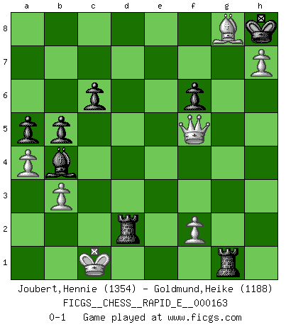 Last move : 0-1 2015 December 17 10:18:52 [Event "FICGS__CHESS__RAPID_E__000163"] [Site "FICGS"] [Date "2015.11.21"] [Round "1"] [White "Joubert,Hennie"] [Black "Goldmund,Heike"] [Result "0-1"] [WhiteElo "1354"] [BlackElo "1188"] 1.e4 d5 2.exd5 Qxd5 3.Nc3 Qa5 4.d4 Nf6 5.Nf3 Bf5 6.Be2 e6 7.O-O c6 8.Bd2 Qc7 9.h3 Bd6 10.Rc1 Nbd7 11.Bc4 Nb6 12.Bb3 Nbd5 13.Nxd5 Nxd5 14.c4 Nf4 15.c5 Be7 16.Re1 Nd3 17.Rc3 Nxe1 18.Qxe1 O-O 19.g4 Bg6 20.h4 h6 21.h5 Bh7 22.Ne5 f6 23.Ng6 Bxg6 24.hxg6 Kh8 25.Rh3 Rfe8 26.Qe3 Bf8 27.Qe4 e5 28.dxe5 Rxe5 29.Qd4 Rd8 30.Qa4 a6 31.Bc3 Rxc5 32.Bf7 Bd6 33.Bxf6 gxf6 34.Rxh6+ Kg7 35.Rh7+ Kf8 36.Bb3 Qxh7 37.gxh7 Kg7 38.Bg8 Kh8 39.Qd4 Be7 40.Qf4 Re5 41.g5 Rxg5+ 42.Kf1 Rg7 43.Ke2 Re8 44.Kd3 Rd8+ 45.Kc3 a5 46.a4 b5 47.b3 Bb4+ 48.Kc2 Rd6 49.Qf5 Rd2+ 50.Kc1 Rg1+ 0-1 Scandinavian defense Kingside Castling by player White (move 7) Kingside Castling by player Black (move 18) Player Black won this chess game. Follow this game move after move (download)Chess is war over the board. The object is to crush the opponents mind. (Bobby Fischer) Die Idee von Capablanca, Schach als Fach in den Schulen zu lehren, ist großartig. (Fidel Castro) Debemos de asegurarnos de que el Ajedrez no se convierta en un lenguaje muerto, muy interesante, pero solo para un grupo muy pequeño. (Sytze Faber) Le joueur d'Echecs qui veut atteindre le top est obligé de développer son propre credo créatif. Alexeï Stepanovicth Souétine. Il est facile d'écrire des livres ! Ce qui est difficile, c'est de jouer ! (Alexeï Stepanovicth Souétine) In fact if nothing is done against this teddy bear, hereby I announce that I would quit chess, rapid chess, blitz chess, postal chess, email chess, server chess and correspondence chess I will then switch to a table game where teddy bears aren't going to be seen for a while, like Poker, or Roulette, all 18+ games. (Elmer Valderrama)