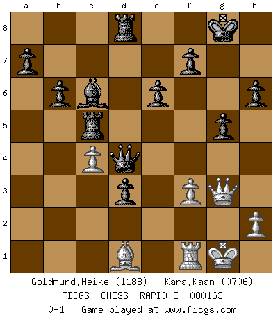 Last move : 0-1 2015 December 10 18:35:38 [Event "FICGS__CHESS__RAPID_E__000163"] [Site "FICGS"] [Date "2015.11.21"] [Round "1"] [White "Goldmund,Heike"] [Black "Kara,Kaan"] [Result "0-1"] [WhiteElo "1188"] [BlackElo "0706"] 1.e4 e6 2.Nf3 d5 3.e5 c5 4.c4 d4 5.d3 Ne7 6.b4 Ng6 7.a3 Nc6 8.Bg5 Qc7 9.Qb3 Ngxe5 10.Nbd2 h6 11.Bh4 cxb4 12.axb4 Nxf3+ 13.Nxf3 Bxb4+ 14.Nd2 O-O 15.Be2 Bxd2+ 16.Kxd2 Qf4+ 17.Ke1 Qxh4 18.g3 Qf6 19.Kf1 b6 20.Kg2 Bb7 21.f3 Ne5 22.Rhf1 g5 23.g4 Nxg4 24.Kg1 Ne3 25.Rf2 Rfc8 26.Qa4 Rc5 27.Qd7 Bc6 28.Qd6 Rd8 29.Qg3 Nxc4 30.dxc4 d3 31.Bd1 Qxa1 32.Rf1 Qd4+ 0-1 French defense Kingside Castling by player Black (move 14) Player Black won this chess game. Follow this game move after move (download)A strong memory, concentration, imagination, and a strong will is required to become a great Chess player. (Bobby Fischer) Frage: Was machen Sie mit den Preisen? Anwort: Ich habe Angst, dass meine Freundin davon neue Kleider kauft. (Loek van Wely) Las leyes del Ajedrez no permiten una libre elección: tienes que mover quieras o no. (Emanuel Lasker) Plusieurs personnes se sont demandées comment Tal faisait pour gagner... En fait, c'est très simple ! Il met ses pièces au centre de l'échiquier et les sacrifie quelque part ! (David Bronstein) To err is human, but to really foul things up requires a computer. (Farmer's Almanac, 1978)