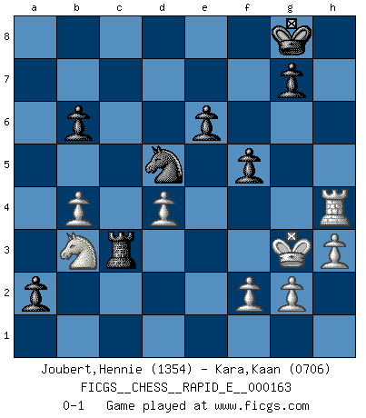 Last move : 0-1 2015 December 20 7:33:44 [Event "FICGS__CHESS__RAPID_E__000163"] [Site "FICGS"] [Date "2015.11.21"] [Round "1"] [White "Joubert,Hennie"] [Black "Kara,Kaan"] [Result "0-1"] [WhiteElo "1354"] [BlackElo "0706"] 1.e4 e6 2.d4 d5 3.Nd2 Nf6 4.Bd3 c5 5.c3 cxd4 6.cxd4 dxe4 7.Nxe4 Nbd7 8.Nf3 Nxe4 9.Bxe4 Bb4+ 10.Bd2 Bxd2+ 11.Qxd2 Nf6 12.Bc2 O-O 13.O-O b6 14.Rad1 Bb7 15.Ne5 Rc8 16.Bb3 Qe7 17.Rfe1 Bd5 18.Bc2 Bxa2 19.b3 Nd5 20.Bxh7+ Kxh7 21.Qxa2 Rc3 22.h3 Rfc8 23.Qb1+ Kg8 24.Re4 Qc7 25.Rh4 f5 26.Qb2 Rc1 27.Rxc1 Qxc1+ 28.Qxc1 Rxc1+ 29.Kh2 Rc8 30.Nc4 a5 31.Kg3 a4 32.Nd2 a3 33.b4 a2 34.Nb3 Rc3+ 0-1 French : Tarrasch, Closed variation Kingside Castling by player Black (move 12) Kingside Castling by player White (move 13) Player Black won this chess game. Follow this game move after move (download)Bobby Fischer's current state of mind is indeed a tragedy. One of the world's greatest Chess players - the pride and sorrow of American Chess. (Frank Brady) Je älter ich werde, um so mehr schätze ich die Bauern. (Paul Keres) El poder defensivo de una pieza clavada, solamente es imaginario. (Aaron Nimzovich) RxDa4 pat (...) He is a liar. I just don't know what the lie is yet. (Horatio Caine, C.S.I. Miami)