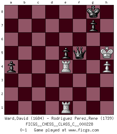 Last move : 0-1 2016 August 10 11:32:16 [Event "FICGS__CHESS__CLASS_C__000228"] [Site "FICGS"] [Date "2015.11.21"] [Round "1"] [White "Ward,David"] [Black "Rodriguez Perez,Rene"] [Result "0-1"] [WhiteElo "1684"] [BlackElo "1739"] 1.e4 e6 2.Nf3 c5 3.d4 cxd4 4.Nxd4 Nc6 5.Nc3 Qc7 6.f4 a6 7.Be2 b5 8.Nxc6 Qxc6 9.Bf3 Bb7 10.Be3 Rc8 11.a3 Qc4 12.Qd3 Nf6 13.O-O Bc5 14.Bxc5 Qxc5+ 15.Rf2 e5 16.g4 h5 17.g5 Ng4 18.Bxg4 hxg4 19.Qg3 b4 20.axb4 Qxb4 21.Re1 Qxb2 22.Nd1 Qb6 23.c3 Rc4 24.f5 d6 25.Qxg4 a5 26.h4 Qc6 27.Rfe2 Qc5+ 28.Kh2 Qc8 29.Kg3 d5 30.Re3 dxe4 31.Nf2 a4 32.Nxe4 O-O 33.g6 fxg6 34.Qxg6 Rxf5 35.Nf2 Qf8 36.Ne4 Bxe4 37.Rxe4 Rxc3+ 38.Kg4 Rg5+ 39.Kxg5 Rg3+ 40.Kh5 Rxg6 41.Kxg6 Qf6+ 42.Kh5 Qf5+ 0-1 French defense Kingside Castling by player White (move 13) Kingside Castling by player Black (move 32) 10 pieces endgame at move 40 : White KRRP , Black KQRPPP WHITE : King + 2 Rooks 1 Pawn BLACK : King + 1 Queen 1 Rook 3 Pawns 9 pieces endgame at move 41 : White KRRP , Black KQPPP WHITE : King + 2 Rooks 1 Pawn BLACK : King + 1 Queen 3 Pawns Player Black won this chess game. Follow this game move after move (download)If Chess is a science, it's a most inexact one. If Chess is an art, it is too exacting to be seen as one. If Chess is a sport, it's too esoteric. If Chess is a game, it's too demanding to be just a game. If Chess is a mistress, she's a demanding one. If Chess is a passion, it's a rewarding one. If Chess is life, it's a sad one. (Unknown) Es gibt zwei Arten von Opfern: Korrekte und meine. (Mikhail Nekhemyevich Tal) Yo jugué Ajedrez con el y a veces le pude haber ganado solo que siempre devuelve su última jugada y juega la partida de manera diferente. (Mark Twain) Avant la finale, les dieux ont créé le milieu de partie. (Tarrasch) I find television to be very educating. Every time somebody turns on the set, I go in the other room and read a book. (Groucho Marx)
