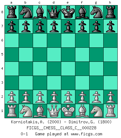 Last move : 0-1 2015 December 31 10:23:15 [Event "FICGS__CHESS__CLASS_C__000228"] [Site "FICGS"] [Date "2015.11.21"] [Round "1"] [White "Korniotakis,Antonis"] [Black "Dimitrov,George"] [Result "0-1"] [WhiteElo "2000"] [BlackElo "1800"] 0-1 This chess game has been lost on time (started : 2015.11.21 5:44:54) Player Black won this chess game. Follow this game move after move (download)We cannot resist the fascination of sacrifice, since a passion for sacrifices is part of a Chessplayer's nature. (Rudolf Spielman) Schach ist das Spiel, das die Verrückten gesund hält. (Albert Einstein) Mi estilo es algo parecido entre un poco de Tal y Petrosian. (Reshevsky) À la honte des hommes, on sait que les lois du jeu sont les seules qui soient partout justes, claires, inviolables et exécutées. Pourquoi l'Indien qui a donné les règles du jeu d'échecs est-il obéi de bon gré dans toute la terre, et que les décrétales des papes, par exemple, sont aujourd'hui un objet d'horreur et de mépris ? C'est que l'inventeur des échecs combina tout avec justesse pour la satisfaction des joueurs, et que les papes, dans leurs décrétales, n'eurent en vue que leur seul avantage. L'Indien voulut exercer également l'esprit des hommes et leur donner du plaisir; les papes ont voulu abrutir l'esprit des hommes. Voltaire (Dictionnaire philosophique / Garnier 1967) Yoga is 99% practice and 1% knowledge. (Sri Krishna Pattabhi Jois)