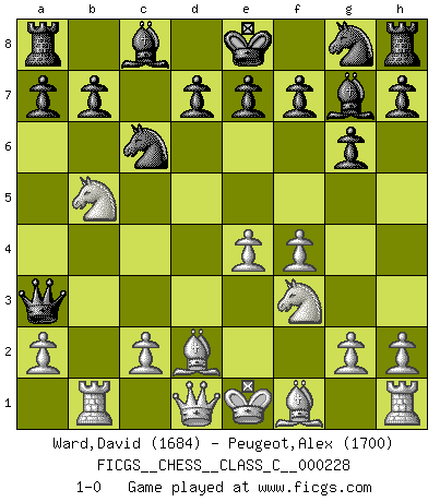 Last move : 1-0 2015 November 30 5:59:43 [Event "FICGS__CHESS__CLASS_C__000228"] [Site "FICGS"] [Date "2015.11.21"] [Round "1"] [White "Ward,David"] [Black "Peugeot,Alex"] [Result "1-0"] [WhiteElo "1684"] [BlackElo "1700"] 1.e4 g6 2.d4 Bg7 3.f4 c5 4.Nf3 cxd4 5.Nxd4 Nc6 6.Nf3 Qa5+ 7.Bd2 Qb6 8.Nc3 Qxb2 9.Rb1 Qa3 10.Nb5 1-0 Robatsch defense : Three pawns attack Player White won this chess game. Follow this game move after move (download)Pawn endings are to Chess what putting is to golf. (Cecil Purdy) Zeige mir drei Eröffnungsvarianten und ich beweise dir, dass zwei davon inkorrekt sind. (Emanuel Lasker) Aunque la mayoría de la gente disfruta observar las partidas de los grandes Maestros de ataque, algunos de los jugadores mas notables en la historia han sido los jugadores silenciosos posicionales. Lentamente ellos te aplastan despojandote de tu espacio, congestionando tus piezas y dejandote virtualmente sin nada que hacer. (Yasser Seirawan) Si le désir cupide (et stupide) de gagner est une inépuisable source de souffrance, une combinaison brillante sur l'échiquier est une découverte : le coquelicot qui s'épanouit lorsque apparaît la Voie Lactée. (Arrabal) Always be a first-rate version of yourself, instead of a second-rate version of somebody else. (Judy Garland)
