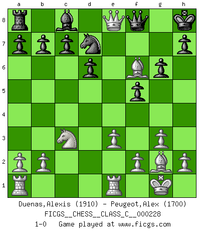 Last move : 1-0 2015 November 26 23:25:14 [Event "FICGS__CHESS__CLASS_C__000228"] [Site "FICGS"] [Date "2015.11.21"] [Round "1"] [White "Duenas,Alexis"] [Black "Peugeot,Alex"] [Result "1-0"] [WhiteElo "1910"] [BlackElo "1700"] 1.d4 f5 2.Nf3 Nf6 3.g3 g6 4.Bg2 Bg7 5.O-O O-O 6.c4 d6 7.Nc3 Re8 8.Bf4 Nbd7 9.c5 Nh5 10.cxd6 exd6 11.Qb3+ Kh8 12.Ng5 Re7 13.Nf7+ Rxf7 14.Qxf7 Bxd4 15.e3 Be5 16.Rfe1 Qf6 17.Qe8+ Qf8 18.Bxe5+ Nhf6 19.Bxf6+ 1-0 Dutch Kingside Castling by player White (move 5) Kingside Castling by player Black (move 5) Player White won this chess game. Follow this game move after move (download)Daring ideas are like Chess men moved forward. They may be beaten, but they may start a winning game. (Johann Wolfgang von Goethe) Der Traum, für den ich lebe, ist der von einem freien Russland. Viele mögen sagen: Russland hat doch ein Parlament, einen gewählten Präsidenten. Aber ich spüre, dass in meiner Heimat die Angst wiederkehrt. Eine Angst, sich frei zu äußern, bestimmte Dinge zu tun (Garry Kasparov) Con el fin de mejorar tu juego, debes de estudiar los finales antes que todo, ya que mientras que los finales pueden ser estudiados y dominados por sí mismos, el juegomedio y la apertura deben de ser estudiados en relación con los finales. (José Raúl Capablanca) Les Echecs mettent en conflit, non pas deux intelligences, mais deux volontés. (Lasker) The bottom line is always the bottom line. (Johann Piek)