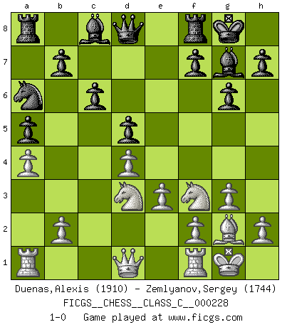Last move : 1-0 2016 April 8 21:6:58 [Event "FICGS__CHESS__CLASS_C__000228"] [Site "FICGS"] [Date "2015.11.21"] [Round "1"] [White "Duenas,Alexis"] [Black "Zemlyanov,Sergey"] [Result "1-0"] [WhiteElo "1910"] [BlackElo "1744"] 1.d4 d5 2.c4 c6 3.Nf3 Nf6 4.g3 dxc4 5.Bg2 g6 6.a4 Bg7 7.O-O Ne4 8.Na3 Nd6 9.Bf4 O-O 10.Bxd6 exd6 11.Nxc4 d5 12.Nce5 a5 13.e3 Na6 14.Nd3 1-0 This chess game has been lost on time (started : 2015.11.21 5:44:54) QGD Slav : 3.Nf3 Kingside Castling by player White (move 7) Kingside Castling by player Black (move 9) Player White won this chess game. Follow this game move after move (download)With or without the title, Bobby Fischer was unquestionably the greatest player of his time. (Burt Hochberg) Ich kenne Menschen, die allen Willen der Welt besitzen und doch nicht Schach spielen können. (Robert James Fischer) Yo adoro todas la posiciones. Denme una partida posicional difícil, y la jugaré. Pero posiciones totalmente ganadas, no las tolero. (Hein Donner) La guerre est enfant de la passion, la passion est enfant du narcissisme et le narcissisme est l'enfant. (...) Une autre partie ? (Thibault de Vassal) True nature is revealed in times of difficulty. (Chinese proverb)