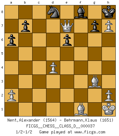 Last move : 1/2-1/2 2007 May 9 3:27:55 [Event "FICGS__CHESS__CLASS_D__000037"] [Site "FICGS"] [Date "2007.03.15"] [Round "1"] [White "Nent,Alexander"] [Black "Behrmann,Klaus"] [Result "1/2-1/2"] [WhiteElo "1564"] [BlackElo "1651"] 1.d4 f5 2.c4 Nf6 3.g3 e6 4.Bg2 Be7 5.Nf3 O-O 6.O-O d5 7.b3 c5 8.cxd5 Nxd5 9.Bb2 Bf6 10.Nc3 Nxc3 11.Bxc3 Nc6 12.e3 cxd4 13.exd4 Qd6 14.Qe2 f4 15.Rad1 fxg3 16.fxg3 Bd7 17.Kh1 Qc7 18.g4 Be7 19.Qc4 Qd6 20.Be1 Rac8 21.Bg3 Qa3 22.Qe2 a6 23.g5 Nd8 24.Ne5 Rxf1+ 25.Rxf1 Bb5 26.Nc4 Qb4 27.g6 Rxc4 28.bxc4 Bxc4 29.gxh7+ Kh8 30.Qh5 Bxf1 31.Qe8+ Bf8 32.Bxf1 Qe7 33.Qxe7 1/2-1/2 Dutch : Stonewall, Botwinnik variation Kingside Castling by player Black (move 5) Kingside Castling by player White (move 6) This chess game ended in a draw. Follow this game move after move (download)A good player is always lucky. (Jose Raul Capablanca) Deine Wertungszahl - vorausgesetzt einige Jahre schachliche Anstrengung - entspricht etwa dem zehnfachen Deines IQ plus 1000. (Jonathan Levitt) Por tratar de evitar la pérdida de una pieza, muchas personas han perdido una partida de Ajedrez. (Savielly Tartakover) Il n'y a pas de prix trop élevé au scalp de l'ennemi. (Koblentz) I'm extremely disappointed. I send you out for exciting, new designer drugs, you come back with tomato sauce. (Gregory House, House M.D.)