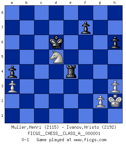 Last move : 0-1 2006 April 29 9:38:18 [Event "FICGS__CHESS__CLASS_A__000001"] [Site "FICGS"] [Date "2006.04.08"] [Round "1"] [White "Muller,Henri"] [Black "Ivanov,Hristo"] [Result "0-1"] [WhiteElo "2115"] [BlackElo "2192"] 1.e4 c5 2.Nf3 Nc6 3.d4 cxd4 4.Nxd4 Nf6 5.Nc3 e5 6.Ndb5 d6 7.Bg5 a6 8.Na3 b5 9.Bxf6 gxf6 10.Nd5 f5 11.Bd3 Be6 12.O-O Bxd5 13.exd5 Ne7 14.c3 Bg7 15.Qh5 e4 16.Bc2 O-O 17.Rae1 Qc8 18.Bb3 a5 19.Qg5 Qb7 20.f3 h6 21.Qd2 a4 22.Bd1 b4 23.cxb4 Qxd5 24.Qxd5 Nxd5 25.fxe4 Nxb4 26.Nc4 Nd3 27.Re2 fxe4 28.Nxd6 Bd4+ 29.Kh1 Nf2+ 30.Rexf2 Bxf2 31.Rxf2 Rfd8 32.Rd2 e3 33.Rd5 Kf8 34.Be2 Rac8 35.Nxc8 Rxd5 36.h3 Rd2 37.Bg4 Rxb2 38.a3 e2 39.Bxe2 Rxe2 40.Nb6 Re4 41.Kh2 Ke7 42.Nd5+ Kd6 0-1 Sicilian : Pelikan (Lasker/Sveshnikov) variation Kingside Castling by player White (move 12) Kingside Castling by player Black (move 16) 10 pieces endgame at move 39 : White KNPPP , Black KRPPP WHITE : King + 1 Knight 3 Pawns BLACK : King + 1 Rook 3 Pawns Player Black won this chess game. Follow this game move after move (download)During a Chess competition a Chessmaster should be a combination of a beast of prey and a monk. (Alexander Alekhine) Smyslow ist ein Beweis dafür, dass ich noch zehn Jahre spielen kann! [der 75 jährige über den 85 jährigen] (Viktor Kortschnoi) El Ajedrez es una guerra en un tablero. El objetivo es aplastar la mente del oponente. (Bobby Fischer) Ce qui caractérise les parties de combat, c'est que si le défenseur a constamment de difficiles problèmes à résoudre, l'attaquant doit chercher sans relâche de nouvelles possibilités d'attaque. (Koblentz) The faster the computer, the slower the brain. (Thibault de Vassal)