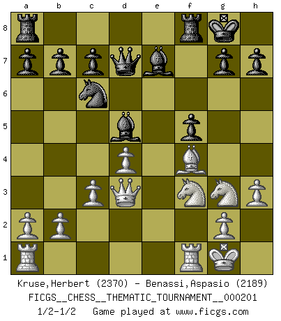 Last move : 1/2-1/2 2015 November 27 15:5:43 [Event "FICGS__CHESS__THEMATIC_TOURNAMENT__000201"] [Site "FICGS"] [Date "2015.11.22"] [Round "1"] [White "Kruse,Herbert"] [Black "Benassi,Aspasio"] [Result "1/2-1/2"] [WhiteElo "2370"] [BlackElo "2189"] 1.e4 e5 2.f4 exf4 3.Nf3 Bb4 4.Bc4 Nf6 5.Nc3 O-O 6.O-O Nxe4 7.Nxe4 d5 8.Bxd5 Qxd5 9.d3 Bg4 10.Bxf4 Nc6 11.h3 f5 12.Nc3 Qd7 13.Ne2 Bh5 14.Ng3 Bf7 15.c3 Be7 16.d4 Bd5 17.Qd3 1/2-1/2 King's knight's gambit Kingside Castling by player Black (move 5) Kingside Castling by player White (move 6) This chess game ended in a draw. Follow this game move after move (download)The older I grow, the more I value pawns. (Paul Keres) Ich verstehe mehr vom Schach als irgendein anderer lebender Meister. (José Raúl Capablanca) Una partida de Ajedrez se divide en 3 etapas: la primera cuando piensas que tienes la ventaja, la segunda cuando crees que tienes la ventaja y la tercera... ¡cuando te das cuenta que vas a perder!. (Savielly Tartakower) Il vaut toujours mieux jouer un plan faux de façon logique que de n'avoir pas de plan du tout. (Victor Kortchnoï) When you stop learning you start dying. (M. Scott Adams)