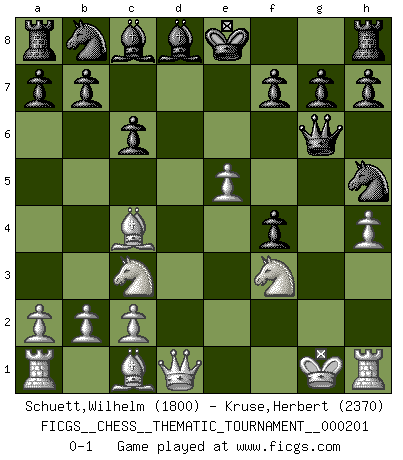 Last move : 0-1 2016 March 24 18:55:14 [Event "FICGS__CHESS__THEMATIC_TOURNAMENT__000201"] [Site "FICGS"] [Date "2015.11.22"] [Round "1"] [White "Schuett,Wilhelm"] [Black "Kruse,Herbert"] [Result "0-1"] [WhiteElo "1800"] [BlackElo "2370"] 1.e4 e5 2.f4 exf4 3.Bc4 Qh4+ 4.Kf1 d6 5.d4 Nf6 6.Nf3 Qh6 7.Nc3 Be7 8.e5 dxe5 9.dxe5 Nh5 10.Nd5 Bd8 11.g3 Nxg3+ 12.Kg1 Nh5 13.h4 c6 14.Nc3 Qg6+ 0-1 This chess game has been lost on time (started : 2015.11.22 16:20:15) KGA : Bishop's gambit Player Black won this chess game. Follow this game move after move (download)When your house is on fire, you can't be bothered with the neighbors. Or, as we say in Chess, if your King is under attack you don't worry about losing a Pawn on the Queen's side. (Gary Kasparov) Ich trinke, ich rauche, ich spiele, ich liebe Frauen aber Fernschach ist ein Laster, das ich nicht habe. (Mikhail Nekhemyevich Tal) El Ajedrez es una manera fabulosa para que los niños aprendan a autovalorarse y a autoestimarse. (Saudin Robovic) Je crois qu'il existe des manières très spécifiques de jouer efficacement contre une machine. Evidemment, nous n'avons aucune chance en technique pure, parce que l'ordinateur calcule de manière parfaite. Mais lorsque nous faisons appel à notre cerveau, en utilisant l'intuition et la compréhension, alors nous restons beaucoup plus forts. (Anatoli Karpov) 'preceded by its own quotation yields a falsehood' preceded by its own quotation yields a falsehood. (W. V. O. Quine - Set Theory And Its Logic, 1953)