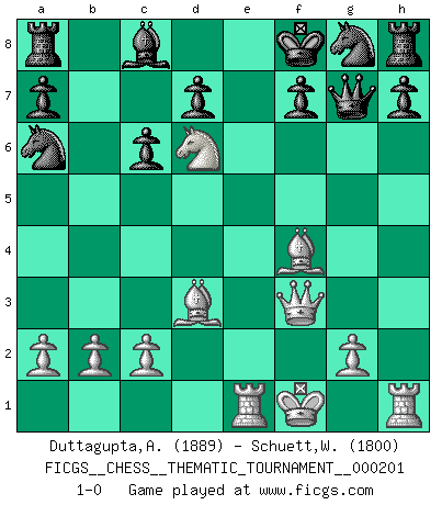 Last move : 1-0 2016 April 11 9:22:16 [Event "FICGS__CHESS__THEMATIC_TOURNAMENT__000201"] [Site "FICGS"] [Date "2015.11.22"] [Round "1"] [White "Duttagupta,Aniruddha"] [Black "Schuett,Wilhelm"] [Result "1-0"] [WhiteElo "1889"] [BlackElo "1800"] 1.e4 e5 2.f4 exf4 3.Bc4 Qh4+ 4.Kf1 Qe7 5.Nc3 c6 6.d4 b5 7.Bd3 g5 8.h4 Bg7 9.hxg5 Bxd4 10.Nf3 Bg7 11.e5 Bxe5 12.Nxe5 Qxe5 13.Qf3 Qxg5 14.Nxb5 Na6 15.Bxf4 Qg7 16.Nd6+ Kf8 17.Re1 1-0 This chess game has been lost on time (started : 2015.11.22 16:20:15) KGA : Bishop's gambit Player White won this chess game. Follow this game move after move (download)The combination player thinks forward; he starts from the given position, and tries the forceful moves in his mind. (Emanuel Lasker) Es gibt keine einzige Frau, der ich nicht einen Springer vorgeben könnte und trotzdem gewänne. (Robert James Fischer) Con el tiempo, empecé a progresar en partidas decisivas. Tal vez porque me di cuenta de una simple verdad: no solo estaba yo nervioso sino también mi oponente. (Mikhail Tal) La vie est comme un jeu d'échecs : nous esquissons un plan, mais celui-ci est tributaire de ce que daignent faire l'adversaire aux échecs et le destin dans la vie. (Arthur Schopenhauer) Being number two sucks. (Andre Agassi)