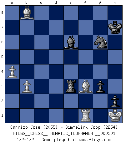 Last move : 1/2-1/2 2016 January 3 1:5:22 [Event "FICGS__CHESS__THEMATIC_TOURNAMENT__000201"] [Site "FICGS"] [Date "2015.11.22"] [Round "1"] [White "Carrizo,Jose"] [Black "Simmelink,Joop"] [Result "1/2-1/2"] [WhiteElo "2055"] [BlackElo "2254"] 1.e4 e5 2.f4 exf4 3.Nf3 h5 4.d4 g5 5.Bc4 h4 6.Nc3 d6 7.e5 Bh6 8.O-O h3 9.g3 Nc6 10.Qe2 Nge7 11.exd6 cxd6 12.d5 Ne5 13.Nxe5 dxe5 14.Qxe5 O-O 15.gxf4 Ng6 16.Qe2 gxf4 17.Qh5 Qg5+ 18.Qxg5 Bxg5 19.Ne4 f6 20.d6 Kh7 21.Bd5 Bf5 22.b3 Rfe8 23.Nxg5+ fxg5 24.Ba3 Rac8 25.c4 b6 26.Rae1 Rcd8 27.Rxe8 Rxe8 28.c5 bxc5 29.Bxc5 Re2 30.a4 g4 31.Bxa7 g3 32.hxg3 h2+ 33.Kh1 fxg3 34.d7 Bxd7 35.Bb8 Be6 36.Bf3 Re3 1/2-1/2 King's knight's gambit Kingside Castling by player White (move 8) Kingside Castling by player Black (move 14) This chess game ended in a draw. Follow this game move after move (download)For surely of all the drugs in the world, Chess must be the most permanently pleasurable. (Assiac) Bogoljubow: Matt in vier Zügen! Tartakower: Ich verbitte mir jede Belästigung! (Savielly Grigorievitsch Tartakower) La caracteristica mas importante en la posición del Ajedrez es la actividad de las piezas. Esto es absolutamente fundamental en todas las fases del juego: Apertura, Juego Medio y especialmente Finales. La limitación primordial en la actividad de una pieza, es la estructuración de los Peones. (Michael Stean) La conception d'un plan est le processus par lequel un joueur exploite les avantages de sa position tout en s'efforçant d'en réduire au minimum les inconvénients. Afin de garantir le succès, un plan doit toujours se fonder sur un diagnostic objectif des particularités d'une position. La conception d'un plan est d'autant plus difficile que la position est équilibrée, et grandement facilitée lorsqu'il n'existe qu'un seul plan susceptible de répondre aux exigences de la position. (Harry Golombek) Man is still the most extraordinary computer of all. (John F. Kennedy)