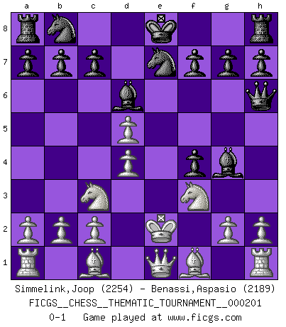 Last move : 0-1 2015 November 24 18:55:55 [Event "FICGS__CHESS__THEMATIC_TOURNAMENT__000201"] [Site "FICGS"] [Date "2015.11.22"] [Round "1"] [White "Simmelink,Joop"] [Black "Benassi,Aspasio"] [Result "0-1"] [WhiteElo "2254"] [BlackElo "2189"] 1.e4 e5 2.f4 d5 3.exd5 exf4 4.Nc3 Qh4+ 5.Ke2 Bd6 6.d4 Bg4+ 7.Nf3 Ne7 8.Qe1 Qh6 0-1 KGD : Falkbeer counter-gambit Player Black won this chess game. Follow this game move after move (download)First-class players lose to second class players because second-class players sometimes play a first-class game. (Tarrasch) Garry Kasparov war erst in der Großmeister-Organisation GMA, dann in der Profischach-Vereinigung PCA, zum Schluss kehrte er wieder in den Schoß der FIDE zurück. Aber gut, manche Leute sind flexibel (Viswanathan Anand) El Ajedrez es un terrible juego. Si no controlas el centro, tu oponente tiene una posición mas holgada. Si tienes control del centro, ¡entonces realmente tu tienes algo de que preocuparte!. (Siegbert Tarrasch) Les Echecs sont affaire de jugement sensible. Savoir quand frapper et quand esquiver. (Fischer) If things go wrong, don't go with them. (Roger Babson)