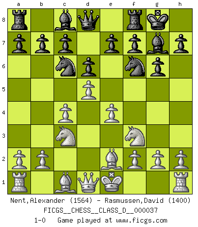Last move : 1-0 2007 April 28 13:1:33 [Event "FICGS__CHESS__CLASS_D__000037"] [Site "FICGS"] [Date "2007.03.15"] [Round "1"] [White "Nent,Alexander"] [Black "Rasmussen,David"] [Result "1-0"] [WhiteElo "1564"] [BlackElo "1400"] 1.d4 Nf6 2.c4 d6 3.Nf3 g6 4.Nc3 Bg7 5.e4 O-O 6.Be2 Nc6 7.d5 1-0 This chess game has been lost on time (started : 2007.03.15 23:12:25) Old Indian defense Kingside Castling by player Black (move 5) Player White won this chess game. Follow this game move after move (download)Could we look into the head of a Chess player, we should see there a whole world of feelings, images, ideas, emotion and passion. (Alfred Binet) Matt entspricht nicht immer den Tatsachen. (Savielly Grigorievitsch Tartakower) Cada Peón es potencialmente una Reina. (James Mason) Botvinnik disait en comparant les échecs à la musique: Il existe une science dont le but est l'étude de l'acoustique et des sons. Mais il y a aussi un art qui se sert de l'océan des sons : c'est la musique. De toute évidence, il en est de même pour la pensée. La logique est l'étude des lois de la réflexion et les échecs reflètent, en tant qu'art, le côté logique de la réflexion, sous la forme d'images artistiques... Extrait de Fischer - Spassky, Reykjavik 1972 par Alexander & F. Wyndham (Ed. Solar), p 37. All maxims have their antagonist maxims; proverbs should be sold in pairs, a single one being but a half truth. (William Mathews)