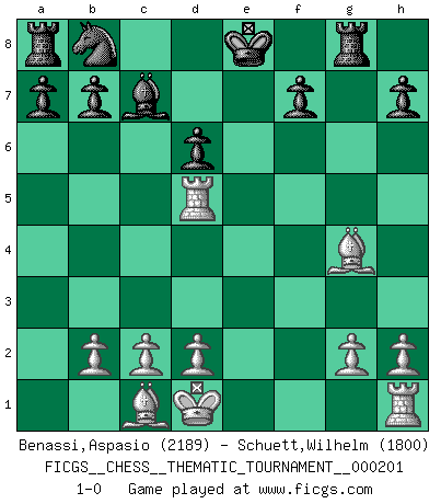 Last move : 1-0 2016 April 3 8:45:7 [Event "FICGS__CHESS__THEMATIC_TOURNAMENT__000201"] [Site "FICGS"] [Date "2015.11.22"] [Round "1"] [White "Benassi,Aspasio"] [Black "Schuett,Wilhelm"] [Result "1-0"] [WhiteElo "2189"] [BlackElo "1800"] 1.e4 e5 2.f4 exf4 3.a4 Qh4+ 4.Ke2 g5 5.Nc3 Ne7 6.Nf3 Qh5 7.Qe1 Bg7 8.Kd1 d6 9.Be2 g4 10.Qh4 Qxh4 11.Nxh4 Bf6 12.Nf5 Bxf5 13.exf5 Rg8 14.a5 Nxf5 15.Nd5 Bd8 16.Ra4 c6 17.Rxf4 cxd5 18.Rxf5 Bxa5 19.Rxd5 Bc7 20.Bxg4 1-0 This chess game has been lost on time (started : 2015.11.22 16:20:15) King's gambit accepted Player White won this chess game. Follow this game move after move (download)Fischer wanted to give the Russians a taste of their own medicine. (Larry Evans) Man braucht nicht immer den besten Zug zu spielen: Ein Zug muß aktiv, unternehmungslustig, korrekt und schön sein. (David Bronstein) ¿Esta Bobby Fischer algo cuerdo?. (Salo Flohr) Karpov est une pièce de musée. (Garry Kasparov) You can only get smarter by playing a smarter opponent. (Revolver, movie)