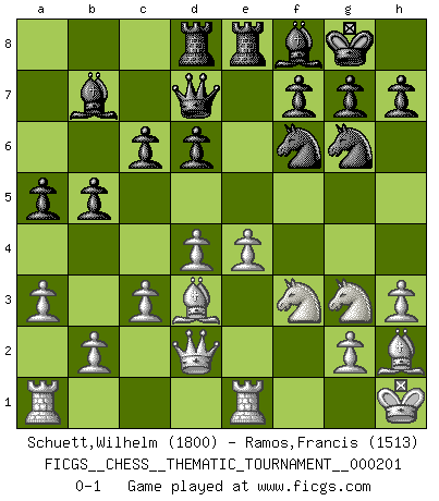 Last move : 0-1 2016 March 29 8:28:43 [Event "FICGS__CHESS__THEMATIC_TOURNAMENT__000201"] [Site "FICGS"] [Date "2015.11.22"] [Round "1"] [White "Schuett,Wilhelm"] [Black "Ramos,Francis"] [Result "0-1"] [WhiteElo "1800"] [BlackElo "1513"] 1.e4 e5 2.f4 exf4 3.Bc4 d6 4.d4 Nf6 5.Nc3 Be7 6.Bxf4 O-O 7.Nf3 c6 8.O-O b5 9.Bd3 Bb7 10.a3 Re8 11.h3 a6 12.Re1 Nbd7 13.Kh1 Nf8 14.Bh2 Ng6 15.Ne2 Qd7 16.c3 Rad8 17.Qd2 Bf8 18.Ng3 a5 0-1 This chess game has been lost on time (started : 2015.11.22 16:20:15) KGA : Bishop's gambit Kingside Castling by player Black (move 6) Kingside Castling by player White (move 8) Player Black won this chess game. Follow this game move after move (download)Chess is above all, a fight ! (Emanuel Lasker) Ein Kibitz ist einer, der deinem Gegner gute Ratschläge gibt. (Andrew Soltis) El Ajedrez era la lengua materna de Capablanca. (Reti) Donnez-moi un Cavalier en 6e et je gagnerais toutes mes parties. (Steinitz) Hold em is to stud what chess is to checkers. (Johnny Moss)