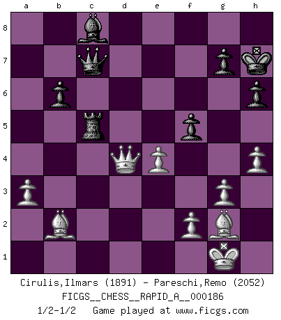 Last move : 1/2-1/2 2016 January 12 8:40:46 [Event "FICGS__CHESS__RAPID_A__000186"] [Site "FICGS"] [Date "2015.11.25"] [Round "1"] [White "Cirulis,Ilmars"] [Black "Pareschi,Remo"] [Result "1/2-1/2"] [WhiteElo "1891"] [BlackElo "2052"] 1.b4 f5 2.Nf3 e6 3.a3 Nf6 4.e3 d5 5.Bb2 a5 6.b5 Nbd7 7.c4 Be7 8.Be2 c5 9.d4 O-O 10.O-O cxd4 11.Nxd4 Nb6 12.cxd5 exd5 13.Nc3 Bd6 14.g3 a4 15.Nf3 Qe7 16.Qd4 Be6 17.Rfc1 Nfd7 18.Qd1 Nc5 19.Nd4 Be5 20.Rab1 Rfd8 21.Bf1 Bxd4 22.Qxd4 Nc4 23.Nxd5 Rxd5 24.Qxc4 Nb3 25.Qf4 Nxc1 26.Rxc1 Rc5 27.Rxc5 Qxc5 28.Qg5 Qc7 29.b6 Qf7 30.Qh4 h6 31.Qd4 Qe7 32.Qe5 Rc8 33.Bg2 Rc5 34.Qb8+ Bc8 35.Qf4 Qd8 36.Qxa4 Kh7 37.h4 Qxb6 38.Qd4 Qc7 39.e4 b6 1/2-1/2 Polish (Sokolsky) opening Kingside Castling by player Black (move 9) Kingside Castling by player White (move 10) This chess game ended in a draw. Follow this game move after move (download)Checkers is for tramps. (Paul Morphy) Mutter, ich bin eben Ex-Weltmeister geworden. --beim nach Hause Kommen nach dem Verlust des WM-Titels an Mihail Botvinnik -- (Mikhail Nekhemyevich Tal) No puedes jugar al Ajedrez si eres de corazón noble. (Proverbio Francés) Un footballeur joue avec ses pieds, parfois avec sa tête. Un joueur d'échecs ne joue qu'avec sa tête. Et quand il ne joue plus, il meurt. (Jacob Murray) The intuitive mind is a sacred gift; the rational mind is a faithful servant. We have created a society that honors the servant but has forgotten the gift. (Albert Einstein)
