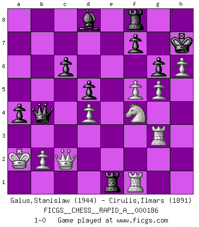 Last move : 1-0 2015 December 28 9:23:14 [Event "FICGS__CHESS__RAPID_A__000186"] [Site "FICGS"] [Date "2015.11.25"] [Round "1"] [White "Galus,Stanislaw"] [Black "Cirulis,Ilmars"] [Result "1-0"] [WhiteElo "1944"] [BlackElo "1891"] 1.d4 e6 2.c4 Be7 3.Nc3 d5 4.cxd5 exd5 5.Bf4 c6 6.e3 Bf5 7.g4 Bg6 8.h4 h6 9.h5 Bh7 10.Bd3 Bxd3 11.Qxd3 Nf6 12.f3 Nbd7 13.Nge2 Nf8 14.Ng3 Ne6 15.Nf5 Nxf4 16.exf4 O-O 17.g5 hxg5 18.fxg5 Ne8 19.f4 Bb4 20.O-O-O Nd6 21.Nxd6 Qxd6 22.f5 Rae8 23.h6 g6 24.Rdf1 Kh7 25.Rh3 Qe7 26.Qd2 b5 27.Kb1 Ba5 28.a3 Bd8 29.Rg3 a5 30.Qc2 b4 31.axb4 Qxb4 32.Ne2 a4 33.Nf4 Re1+ 34.Ka2 1-0 Queen's pawn Kingside Castling by player Black (move 16) Queenside Castling by player White (move 20) Player White won this chess game. Follow this game move after move (download)The most important feature of the Chess position is the activity of the pieces. This is absolutely fundamental in all phases of the game: Opening, Middlegame and especially Endgame. The primary constraint on a piece's activity is the Pawn structure. (Michael Stean) Ein Isolani verdüstert die Stimmung auf dem ganzen Schachbrett. (Savielly Grigorievitsch Tartakower) Una clavada es mas poderosa que una espada. (Fred Reinfeld) Botvinnik disait en comparant les échecs à la musique: Il existe une science dont le but est l'étude de l'acoustique et des sons. Mais il y a aussi un art qui se sert de l'océan des sons : c'est la musique. De toute évidence, il en est de même pour la pensée. La logique est l'étude des lois de la réflexion et les échecs reflètent, en tant qu'art, le côté logique de la réflexion, sous la forme d'images artistiques... Extrait de Fischer - Spassky, Reykjavik 1972 par Alexander & F. Wyndham (Ed. Solar), p 37. It's not the will to win, but the will to prepare to win that makes the difference. (Bear Bryant)