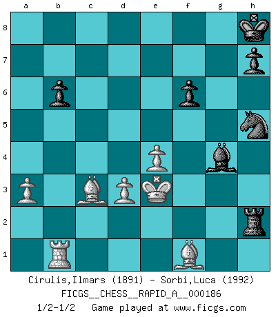 Last move : 1/2-1/2 2016 January 22 18:39:25 [Event "FICGS__CHESS__RAPID_A__000186"] [Site "FICGS"] [Date "2015.11.25"] [Round "1"] [White "Cirulis,Ilmars"] [Black "Sorbi,Luca"] [Result "1/2-1/2"] [WhiteElo "1891"] [BlackElo "1992"] 1.b4 e5 2.a3 d5 3.e3 Nc6 4.Bb2 a6 5.c4 Nf6 6.cxd5 Nxd5 7.Nf3 Bd6 8.d3 O-O 9.Nbd2 b5 10.Be2 a5 11.bxa5 Qe7 12.Qb3 Be6 13.Qxb5 Nxa5 14.Qa4 Nb3 15.Qxb3 Nxe3 16.Qc3 Nxg2+ 17.Kf1 Nf4 18.Rg1 f6 19.Ne4 Kh8 20.Nfd2 Rfb8 21.Nc4 Bc5 22.Qd2 Rd8 23.Qc2 Bh3+ 24.Ke1 Ba7 25.Rg3 Ng2+ 26.Kd1 Bf5 27.Nxf6 Nf4 28.Nxe5 gxf6 29.Nc6 Qe6 30.Nxd8 Rxd8 31.Qd2 Re8 32.Bf1 Nh5 33.Re3 Bxe3 34.fxe3 Qb6 35.e4 Bg4+ 36.Kc1 Be6 37.Bc3 Rg8 38.Qe2 Rg1 39.Kd2 Bg4 40.Qe3 Rh1 41.Qxb6 Rxh2+ 42.Ke3 cxb6 43.Rb1 Rh1 44.Re1 Rh2 45.Rb1 Rh1 46.Ra1 Rh2 47.Rb1 1/2-1/2 Polish (Sokolsky) opening Kingside Castling by player Black (move 8) This chess game ended in a draw. Follow this game move after move (download)One of these modest little moves may be more embarrassing to your opponent than the biggest threat. (Siegbert Tarrasch) Schach ist mein Leben, meine Leidenschaft, was ich gelernt habe und seit meinem 14. Lebensjahr profimässig praktiziere. Darauf zu verzichten, würde mir sehr schwer fallen. (Viktor Kortschnoi) El juego de Damas es para vagabundos. (Paul Morphy) Il vaut mieux sacrifier les pièces de l'adversaire. (Xavier Tartacover) He who laughs last probably does not get the joke. (Unknown)