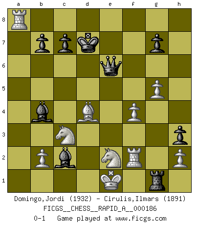 Last move : 0-1 2016 February 16 23:47:28 [Event "FICGS__CHESS__RAPID_A__000186"] [Site "FICGS"] [Date "2015.11.25"] [Round "1"] [White "Domingo,Jordi"] [Black "Cirulis,Ilmars"] [Result "0-1"] [WhiteElo "1932"] [BlackElo "1891"] 1.g4 d5 2.e4 e5 3.exd5 Qxd5 4.Qf3 Qc5 5.Bd3 h5 6.g5 Nc6 7.Be4 Nge7 8.Qc3 Qd6 9.d3 Be6 10.Ne2 Nd5 11.Qd2 f5 12.Bg2 h4 13.Nbc3 h3 14.Bf3 O-O-O 15.a3 Rh4 16.Rf1 e4 17.dxe4 Ne5 18.Bh1 fxe4 19.Nxe4 Qb6 20.N4c3 Nb4 21.Qxd8+ Kxd8 22.axb4 Bxb4 23.Bf4 Nc4 24.Bc1 Bf5 25.Bd5 Bxc2 26.f4 Rg4 27.Bxc4 Qc6 28.Bf7 Qd7 29.Be3 Qxf7 30.Rxa7 Qe6 31.Ra8+ Kd7 32.Bd4 Rg2 33.Rf2 Rg1+ 0-1 Grob's attack Queenside Castling by player Black (move 14) Player Black won this chess game. Follow this game move after move (download)Even the laziest King flees wildly in the face of a double check ! (Aaron Nimzowitsch) Du musst nicht gut spielen, es reicht, wenn du besser spielst als dein Gegner. (Anonymous) Todo se encuentra en un estado de flujo y esto incluye al mundo del Ajedrez. (Mikhail Botvinnik) Soyez une menace à chaque fois que vous vous asseyez pour jouer. (Ken Smith) Life is like a game of cards: the hand you are dealt represents determinism; the way you play it is free will. (Jawaharlal Nehru)