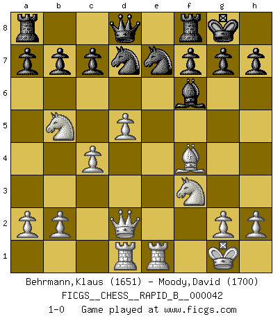 Last move : 1-0 2007 March 25 6:0:21 [Event "FICGS__CHESS__RAPID_B__000042"] [Site "FICGS"] [Date "2007.03.16"] [Round "1"] [White "Behrmann,Klaus"] [Black "Moody,David"] [Result "1-0"] [WhiteElo "1651"] [BlackElo "1700"] 1.e4 e5 2.f4 exf4 3.Nf3 d5 4.exd5 Nf6 5.Bb5+ Bd7 6.Bxd7+ Nbxd7 7.O-O Nxd5 8.c4 Nb4 9.Re1+ Be7 10.d4 O-O 11.Bxf4 Bf6 12.Qd2 Nc6 13.Na3 Nb6 14.d5 Ne7 15.Rad1 Nd7 16.Nb5 1-0 KGA : Abbazia defense, Modern variation Kingside Castling by player White (move 7) Kingside Castling by player Black (move 10) Player White won this chess game. Follow this game move after move (download)The hallmark of the artist is simplicity. (Larry Evans) Bis zum Jahr 1971 verlief in meiner Schachkariere alles glatt. Dieses dramatische Match [Fischer-Taimanov 6:0] machte mein Leben zur Hölle. (Mark Taimanov) Hasta este punto, las blancas han seguido un análisis bien conocido. Pero ahora el hace un error fatal: empieza a usar su propia cabeza. (Siegbert Tarrasch) Je fais ceci parce que dans cinquante coups j'obtiendrai cela; je m'appelle Mikhail Moisevitch Botvinnik. (Botvinnik) If you know the enemy and know yourself you need not fear the results of a hundred battles. (Sun Tzu)