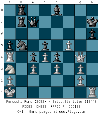 Last move : 0-1 2016 March 6 22:26:43 [Event "FICGS__CHESS__RAPID_A__000186"] [Site "FICGS"] [Date "2015.11.25"] [Round "1"] [White "Pareschi,Remo"] [Black "Galus,Stanislaw"] [Result "0-1"] [WhiteElo "2052"] [BlackElo "1944"] 1.c4 Nf6 2.Nf3 e6 3.d4 b6 4.Bg5 h6 5.Bh4 Bb7 6.e3 Bb4+ 7.Nc3 g5 8.Bg3 Ne4 9.Qc2 f5 10.Bd3 Bxc3+ 11.bxc3 O-O 12.O-O-O Qe7 13.Kb2 d6 14.Ne1 e5 15.f3 Nxg3 16.hxg3 e4 17.Be2 Kg7 18.f4 c5 19.Qd2 g4 20.Nc2 Bc6 21.Na3 a6 22.Kb1 Nd7 23.Ka1 Nf6 24.Rb1 Rab8 25.Rh4 Be8 26.R4h1 Rh8 27.Rb2 Nh5 28.Qe1 Bf7 29.Nc2 Rb7 30.Qf2 Rhb8 31.Na3 Nf6 32.Rhb1 d5 33.Rb3 b5 34.cxb5 c4 35.Rb4 a5 36.Ra4 Qc7 37.Qf1 Ne8 38.Qh1 Nd6 39.Qh4 Bg6 40.Bxg4 fxg4 41.Qxg4 Kh7 42.Rh1 Nxb5 43.f5 Be8 0-1 English Opening Kingside Castling by player Black (move 11) Queenside Castling by player White (move 12) Player Black won this chess game. Follow this game move after move (download)Chess is ruthless: you've got to be prepared to kill people. (Nigel Short) Sitze auf Deine Hände. (Siegbert Tarrasch) Cada Peón es una Reina en potencia. (James Mason) Les échecs sont un jeu terrible. Si vous n'avez pas le centre, votre adversaire a une position plus libre. Par contre, si vous avez le centre, alors vous avez vraiment quelque chose pour laquelle vous inquiéter ! (Siegbert Tarrasch) Wisdom doesn't necessarily come with age. Sometimes age just shows up all by itself. (Tom Wilson)