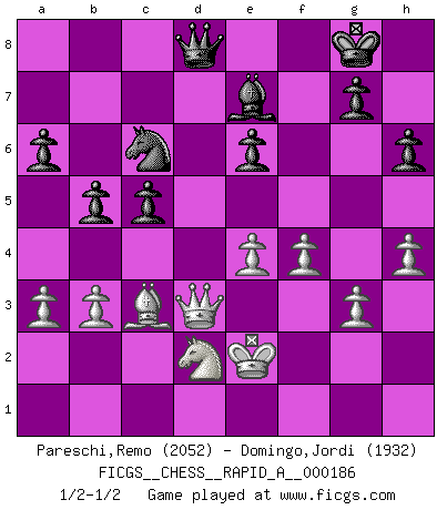Last move : 1/2-1/2 2016 February 28 13:9:33 [Event "FICGS__CHESS__RAPID_A__000186"] [Site "FICGS"] [Date "2015.11.25"] [Round "1"] [White "Pareschi,Remo"] [Black "Domingo,Jordi"] [Result "1/2-1/2"] [WhiteElo "2052"] [BlackElo "1932"] 1.c4 e6 2.Nc3 d5 3.d4 dxc4 4.e4 c5 5.d5 exd5 6.Nxd5 Ne7 7.Bxc4 Nxd5 8.Bxd5 Be7 9.Nf3 O-O 10.O-O Na6 11.Qb3 Nb4 12.Bc4 Nc6 13.Bd2 Qb6 14.Qe3 Be6 15.Bxe6 fxe6 16.Bc3 Rad8 17.Rad1 Rxd1 18.Rxd1 Rd8 19.Rd2 Rxd2 20.Nxd2 Qd8 21.f4 b5 22.b3 Nd4 23.g3 a6 24.Kf2 Nc6 25.Nf3 h6 26.Ke2 Qd7 27.a3 Qd8 28.h4 Na5 29.Nd2 Nc6 30.Qd3 1/2-1/2 English Opening Kingside Castling by player Black (move 9) Kingside Castling by player White (move 10) This chess game ended in a draw. Follow this game move after move (download)Chess is imagination. (David Bronstein) Über Frauen: Chess is better. (Robert James Fischer) Ciertamente, de todas la drogas del mundo, el Ajedrez debe ser el mas placentero permamentemente. (Assiac) On est toujours la mazette de quelqu'un d'autre. (Anonyme) I've never seen so many men wasted so badly. (Blondie in The Good, The Bad and The Ugly)