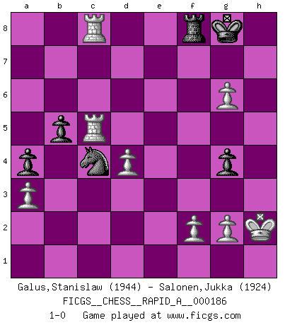Last move : 1-0 2016 February 29 9:40:36 [Event "FICGS__CHESS__RAPID_A__000186"] [Site "FICGS"] [Date "2015.11.25"] [Round "1"] [White "Galus,Stanislaw"] [Black "Salonen,Jukka"] [Result "1-0"] [WhiteElo "1944"] [BlackElo "1924"] 1.d4 d5 2.c4 Nf6 3.cxd5 Nxd5 4.Nf3 e6 5.e4 Nb6 6.Nc3 Be7 7.Be2 O-O 8.O-O Bd6 9.e5 Be7 10.Qc2 Bd7 11.Bd3 h6 12.Qe2 Bc6 13.Re1 Re8 14.Rd1 a5 15.Qe3 N8d7 16.Qf4 Nd5 17.Qg3 Kh8 18.Ne4 Nb4 19.Bb1 Nf8 20.Qf4 Kg8 21.Qg4 Ng6 22.Bd2 Bd5 23.a3 Nc6 24.Be3 a4 25.Bd3 Na5 26.Nc3 Nc4 27.Nxd5 Qxd5 28.Bxh6 Bd8 29.h4 Nxb2 30.Be4 Qd7 31.Rdc1 gxh6 32.h5 Ra5 33.hxg6 f5 34.exf6 Bxf6 35.Qf4 Bg5 36.Nxg5 hxg5 37.Qxc7 Qxc7 38.Rxc7 b5 39.Bc6 Rd8 40.Re1 Ra6 41.Rxe6 Rxc6 42.Rexc6 Nc4 43.Rc5 g4 44.Rc8 Rf8 45.Kh2 1-0 QGD : Marshall defense Kingside Castling by player Black (move 7) Kingside Castling by player White (move 8) Player White won this chess game. Follow this game move after move (download)The older I grow, the more I value Pawns. (Keres) Bobby Fischer ist kein Vorbild für die heutige Jugend. (Viktor Kortschnoi) Una partida de Ajedrez se divide en 3 etapas: la primera cuando piensas que tienes la ventaja, la segunda cuando crees que tienes la ventaja y la tercera... ¡cuando te das cuenta que vas a perder!. (Savielly Tartakower) Les pièces de l'échiquier étaient impitoyables. Elles le retenaient, elles l'absorbaient. Il y avait de l'horreur en cela, mais aussi une harmonie unique. Car, qu'y a-t-il dans le monde, à part les échecs ? (V. Nabokov) The quality of decision is like the well-timed swoop of a falcon which enables it to strike and destroy its victim. (Sun Tzu)