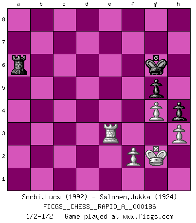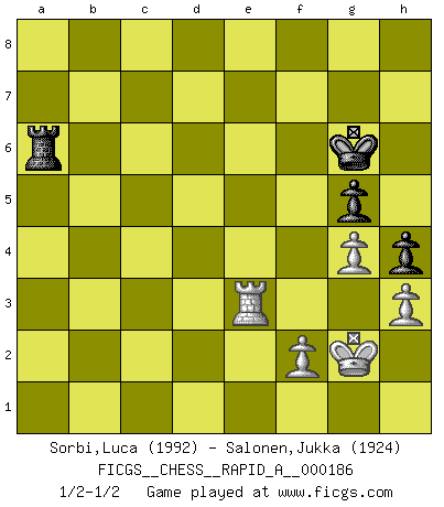 Last move : 1/2-1/2 2016 August 12 13:20:59 [Event "FICGS__CHESS__RAPID_A__000186"] [Site "FICGS"] [Date "2015.11.25"] [Round "1"] [White "Sorbi,Luca"] [Black "Salonen,Jukka"] [Result "1/2-1/2"] [WhiteElo "1992"] [BlackElo "1924"] 1.e4 e5 2.Nf3 Nc6 3.Bb5 a6 4.Ba4 Nf6 5.O-O b5 6.Bb3 Bc5 7.c3 d6 8.d4 Bb6 9.a4 Rb8 10.axb5 axb5 11.Na3 O-O 12.Nxb5 exd4 13.cxd4 Bg4 14.Ba4 d5 15.e5 Ne4 16.Be3 Na5 17.Qd3 Nc4 18.Bc1 Bf5 19.b3 c6 20.Nc3 Nxc3 21.Qxf5 Ne2+ 22.Kh1 Nxd4 23.Nxd4 Bxd4 24.Bg5 f6 25.exf6 Bxa1 26.Rxa1 Nd6 27.Qe6+ Rf7 28.Bxc6 h6 29.Bh4 g5 30.Bg3 Qxf6 31.Qxf6 Rxf6 32.Bxd5+ Kf8 33.Be5 Rg6 34.g3 Rb5 35.Rd1 Nf5 36.Bb2 Ra5 37.Bc3 Rb5 38.Bc4 Rb7 39.Bb2 Rgb6 40.Rd5 Nd6 41.Ba3 Ke7 42.Kg2 Rb8 43.Rd2 Rc8 44.Rd5 Rcb8 45.Rd2 Rc8 46.Be2 Rc7 47.h3 Rc8 48.Rd5 R8c6 49.Bb5 Rc7 50.Bc4 Rbc6 51.Rd2 Rb6 52.Rd5 Rbc6 53.Bb4 Rb7 54.Bc5 Rbc7 55.Ba3 Ra7 56.Bb5 Rxa3 57.Bxc6 Rxb3 58.Rd2 Rb6 59.Bd5 Kf6 60.Re2 Nf5 61.Re8 Rd6 62.Bc4 Rd2 63.Re6+ Kg7 64.Ba6 h5 65.Bc4 h4 66.g4 Nd4 67.Re7+ Kg6 68.Re5 Rb2 69.Re4 Rd2 70.Re8 Rb2 71.Re4 Rd2 72.Re5 Rb2 73.Rd5 Ne2 74.Rd6+ Kg7 75.Bxe2 Rxe2 76.Kf3 Rb2 77.Ke3 Rb4 78.Rd5 Kf6 79.Rf5+ Kg6 80.Kf3 Rd4 81.Re5 Kf6 82.Rf5+ Kg6 83.Rb5 Rd3+ 84.Kg2 Rd6 85.Rc5 Rf6 86.Rc3 Kg7 87.Rc5 Kg6 88.Rc3 Kg7 89.Rc7+ Kg6 90.Re7 Ra6 91.Re3 1/2-1/2 Ruy Lopez : 5.O-O Kingside Castling by player White (move 5) Kingside Castling by player Black (move 11) 10 pieces endgame at move 75 : White KRBPPP , Black KRPP WHITE : King + 1 Rook 1 Bishop 3 Pawns BLACK : King + 1 Rook 2 Pawns 9 pieces endgame at move 75 : White KRPPP , Black KRPP WHITE : King + 1 Rook 3 Pawns BLACK : King + 1 Rook 2 Pawns This chess game ended in a draw. Follow this game move after move (download)If your opponent cannot do anything active, then don't rush the position; instead you should let him sit there, suffer, and beg you for a draw. (Jeremy Silman) In Buenos Aires ist es nicht mein vorrangiges Ziel ein starkes Turnier zu organisieren, sondern ein Turnier für Gentlemen. Ich würde nie Kamsky einladen. Ich mag keine Probleme. (Miguel Najdorf) No nos podemos resistir a la fascinación de un sacrificio ya que la pasión por los sacrificios es parte de la naturaleza de un jugador de Ajedrez. (Rudolf Spielman) Les échecs, c'est la lutte contre l'erreur. (Johannes Zukertort) At work, the authority of a person is inversely proportional to the number of pens that person is carrying. (Dan Rotaru)