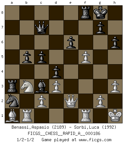 Last move : 1/2-1/2 2016 April 5 15:2:31 [Event "FICGS__CHESS__RAPID_A__000186"] [Site "FICGS"] [Date "2015.11.25"] [Round "1"] [White "Benassi,Aspasio"] [Black "Sorbi,Luca"] [Result "1/2-1/2"] [WhiteElo "2189"] [BlackElo "1992"] 1.b4 e5 2.Bb2 Bxb4 3.Bxe5 Nf6 4.Nf3 d5 5.e3 O-O 6.Be2 c5 7.O-O Nc6 8.Bb2 Re8 9.Bb5 Bd7 10.d3 d4 11.e4 Qb6 12.Ba4 Rad8 13.a3 Ba5 14.Bc1 h6 15.h3 Qa6 16.Bb3 Bc7 17.Nbd2 b5 18.Re1 Qc8 19.Qe2 a6 20.Qf1 Nh5 21.a4 Nf4 22.Kh1 Ba5 23.Rd1 Bc3 24.axb5 axb5 25.Rb1 Nb4 26.Bb2 Qa6 27.Ng1 Be6 28.Ne2 Nxe2 29.Qxe2 Na2 30.Ba1 Ra8 31.f4 Bxb3 32.Nxb3 Qd6 33.Qf3 Qc6 34.Qf2 Qc7 35.e5 Red8 36.Rf1 Ra3 37.e6 fxe6 38.f5 Rf8 39.Qe2 1/2-1/2 Polish (Sokolsky) opening Kingside Castling by player Black (move 5) Kingside Castling by player White (move 7) This chess game ended in a draw. Follow this game move after move (download)My God, Bobby Fischer plays so simply. (Alexei Suetin) Ich verachte Kasparow. (Viktor Kortschnoi) Fischer deseaba darle a los Rusos una sopa de su propia medicina. (Larry Evans) Donnez-moi un Cavalier en 6e et je gagnerais toutes mes parties. (Steinitz) There is a very easy way to return from a casino with a small fortune : go there with a large one. (Jack Yelton)