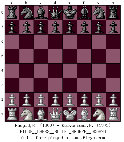 Last move : 0-1 2015 November 27 7:44:31 [Event "FICGS__CHESS__BULLET_BRONZE__000894"] [Site "FICGS"] [Date "2015.11.26"] [Round "1"] [White "Rasyid,Rifadillah"] [Black "Koivuniemi,Raimo"] [Result "0-1"] [WhiteElo "1800"] [BlackElo "1975"] 0-1 This chess game has been lost on time (started : 2015.11.26 21:35:30) Player Black won this chess game. Follow this game move after move (download)No price is too great for the scalp of the enemy King. (Koblentz) Zum Sieg gelangt man nicht, wenn man gut, sondern nur wenn man besser spielt (Savielly Grigorievitsch Tartakower) Un jugador que trata de regresar una movida en el Ajedrez es un futuro carterista. (Richard Fenton) La vérité est comme le meilleur coup aux échecs : elle existe, mais il faut la chercher. (Arturo Perez-Reverte) Now the reason the enlightened prince and the wise general conquer the enemy whenever they move and their achievements surpass those of ordinary men is foreknowledge. (Sun Tzu)