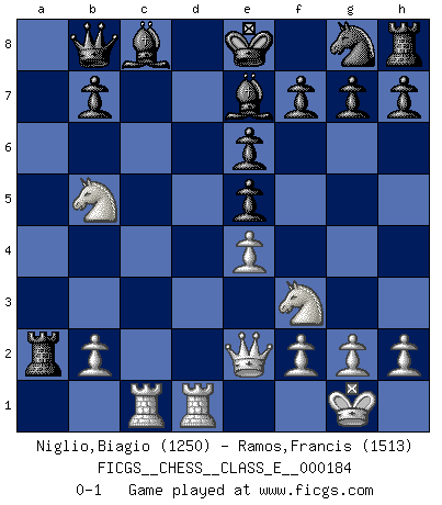 Last move : 0-1 2016 February 10 2:33:24 [Event "FICGS__CHESS__CLASS_E__000184"] [Site "FICGS"] [Date "2015.11.26"] [Round "1"] [White "Niglio,Biagio"] [Black "Ramos,Francis"] [Result "0-1"] [WhiteElo "1250"] [BlackElo "1513"] 1.e4 c5 2.d4 cxd4 3.c3 dxc3 4.Nxc3 d6 5.Nf3 Nc6 6.Bc4 e6 7.O-O a6 8.Qe2 Be7 9.Rd1 Qc7 10.Bf4 Ne5 11.Bxe5 dxe5 12.Rac1 Qb8 13.Bb5+ axb5 14.Nxb5 Rxa2 0-1 Sicilian : Smith-Morra gambit Kingside Castling by player White (move 7) Player Black won this chess game. Follow this game move after move (download)I have added these principles to the law: get the Knights into action before both Bishops are developed. (Emanuel Lasker) Schach ist eine Sache der genauen Beurteilung, wann man zuschlagen und wann man sich ducken muss. (Robert James Fischer) El Ajedrez demanda una total concentración. (Bobby Fischer) Aux échecs, l'amour-propre est satisfait quand on remporte la victoire, mais il n'y a pas de honte à être battu. (Benjamin Franklin) A married woman is like a fish riding a bicycle. (Rodolfo d'Ettorre)