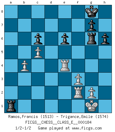 Last move : 1/2-1/2 2015 December 11 16:50:37 [Event "FICGS__CHESS__CLASS_E__000184"] [Site "FICGS"] [Date "2015.11.26"] [Round "1"] [White "Ramos,Francis"] [Black "Trigance,Emile"] [Result "1/2-1/2"] [WhiteElo "1513"] [BlackElo "1574"] 1.e4 c6 2.d4 d5 3.Nc3 dxe4 4.Nxe4 Bf5 5.Ng3 Bg6 6.h4 h6 7.Nf3 Nd7 8.Bd3 Bxd3 9.Qxd3 Qc7 10.O-O e6 11.c4 Ngf6 12.a3 Bd6 13.Ne4 Nxe4 14.Qxe4 Nf6 15.Qe2 O-O 16.b4 a5 17.c5 Be7 18.Bb2 Nd5 19.b5 Bf6 20.Ne5 Bxe5 21.dxe5 Qe7 22.Rac1 Qxh4 23.Rc4 Qe7 24.bxc6 bxc6 25.Bc1 f5 26.exf6 Rxf6 27.Qg4 Qf7 28.Re4 Rf8 29.f3 Rg6 30.Qh3 Qf5 31.Qxf5 Rxf5 32.Bd2 Rf8 33.Bxa5 Ra8 34.Bb4 Nxb4 35.axb4 Ra2 36.Rf2 Ra1+ 37.Rf1 Ra2 38.Rf2 Ra1+ 1/2-1/2 Caro-Kann : Classical, 7...Nd7 Kingside Castling by player White (move 10) Kingside Castling by player Black (move 15) This chess game ended in a draw. Follow this game move after move (download)There just isn't enough televised Chess. (David Letterman) Über Karpov: Er war und ist ein Vertreter der russischen Reaktionäre. Das steckt tief in seiner Seele, wehalb ich nicht nett mit ihm umgehen kann. (Viktor Kortschnoi) Hoy en día, si tu no eres un Gran Maestro a los 14 años, es mejor que lo olvides. (Anand Viswanathan) Horreur, mais aussi harmonie suprême : qu'y avait-il en effet au monde en dehors des échecs ? Le brouillard, l'inconnu, le non-être... (Vladimir Nabokov) When the going gets tactical, the computers get going. (Hyatt)