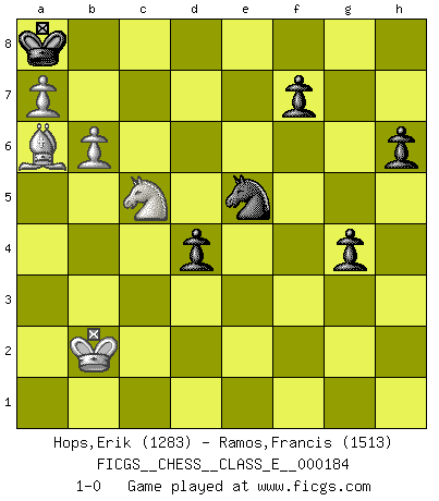 Last move : 1-0 2015 December 11 16:55:0 [Event "FICGS__CHESS__CLASS_E__000184"] [Site "FICGS"] [Date "2015.11.26"] [Round "1"] [White "Hops,Erik"] [Black "Ramos,Francis"] [Result "1-0"] [WhiteElo "1283"] [BlackElo "1513"] 1.e4 c5 2.Nc3 e6 3.g3 Nc6 4.Bg2 Nf6 5.Nge2 d5 6.exd5 exd5 7.d4 cxd4 8.Nxd4 Be7 9.O-O O-O 10.h3 Re8 11.Re1 h6 12.Bf4 a6 13.a3 Bc5 14.Nb3 Rxe1+ 15.Qxe1 Ba7 16.Rd1 Be6 17.g4 d4 18.Ne2 Bxb3 19.cxb3 Qe7 20.Nc1 Qxe1+ 21.Rxe1 Re8 22.Rxe8+ Nxe8 23.Nd3 Nf6 24.Kf1 Kf8 25.Bd6+ Ke8 26.Bc5 Bxc5 27.Nxc5 Na5 28.b4 Nc4 29.Bxb7 Nxb2 30.Bxa6 Nd5 31.Ke1 Nf4 32.Kd2 Nxh3 33.Kc2 Nxf2 34.Kxb2 Nxg4 35.b5 Kd8 36.b6 Ne5 37.Bb5 Kc8 38.a4 g5 39.a5 g4 40.a6 Kb8 41.a7+ Ka8 42.Ba6 1-0 Sicilian : Closed Kingside Castling by player White (move 9) Kingside Castling by player Black (move 9) Player White won this chess game. Follow this game move after move (download)Chess is life. (Bobby Fischer) Wenn Schach ein enormer Dschungel ist, der seine Myriaden von Geheimnissen nicht preisgeben will, dann sind Computer die Kettensägen einer gewaltigen ökologisch unsensiblen Nutzholzfirma. (Nigel Short) No es una movida, aún la mejor movida que tu debas buscar, sino un plan comprensible. (Eugene Znosko-Borovsky) Mon pion favori sur ma case favorite ! Bronstein en parlant d'un coup de pion en h5 quand il avait les Noirs. Perseverance does not equal worthiness. Next time you want to get my attention, wear something fun. Low-riding jeans are hot. (Gregory House, House M.D.)