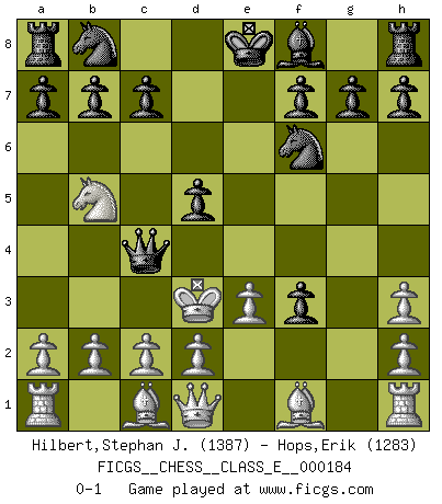 Last move : 0-1 2015 December 1 17:23:16 [Event "FICGS__CHESS__CLASS_E__000184"] [Site "FICGS"] [Date "2015.11.26"] [Round "1"] [White "Hilbert,Stephan J."] [Black "Hops,Erik"] [Result "0-1"] [WhiteElo "1387"] [BlackElo "1283"] 1.Nh3 d5 2.f4 Bxh3 3.gxh3 e5 4.e3 Qh4+ 5.Ke2 exf4 6.Nc3 Nf6 7.Nb5 f3+ 8.Kd3 Qc4+ 0-1 Amar (Paris) Opening Player Black won this chess game. Follow this game move after move (download)You cannot play at Chess if you are kind-hearted. (French Proverb) Ich glaube nicht an Psychologie, ich glaube an gute Züge. (Robert James Fischer) El Ajedrez detiene a su maestro dentro de sus propios vínculos, encadenando la mente y el cerebro, por lo que la libertad interior del mas fuerte debe sufrir. (Albert Einstein) Il s'avisa de me proposer d'apprendre les échecs qu'il jouait un peu... me voilà forcené des échecs. J'achète un échiquier, je m'enferme dans ma chambre, j'y passe des jours et des nuits à vouloir apprendre par cur toutes les parties. (Jean-Jacques Rousseau, Confessions) The meaning of life is that it is to be lived, and it is not to be traded and conceptualized and squeezed into a pattern of systems. (Bruce Lee)