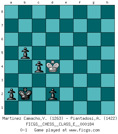 Last move : 0-1 2016 March 19 7:59:17 [Event "FICGS__CHESS__CLASS_E__000184"] [Site "FICGS"] [Date "2015.11.26"] [Round "1"] [White "Martinez Camacho,Victor Hugo"] [Black "Piantadosi,Angelo"] [Result "0-1"] [WhiteElo "1263"] [BlackElo "1422"] 1.e4 Nf6 2.Nc3 d5 3.e5 d4 4.exf6 dxc3 5.fxg7 cxd2+ 6.Qxd2 Qxd2+ 7.Bxd2 Bxg7 8.c3 Bd7 9.Nf3 Nc6 10.Bd3 O-O-O 11.O-O Ne5 12.Nxe5 Bxe5 13.Rfe1 Bd6 14.Be4 f5 15.Bc2 e5 16.g3 Rhg8 17.b3 Bc6 18.Bxf5+ Kb8 19.Be3 Rdf8 20.Bd3 e4 21.Bc4 Rg6 22.Rad1 b6 23.b4 h5 24.Be2 h4 25.Kh1 hxg3 26.fxg3 Bxg3 27.hxg3 Rxg3 28.Kh2 Rg7 29.Bf1 Rh8+ 30.Bh3 Bd7 31.Rxd7 Rxd7 32.Rg1 Rd3 33.Re1 Rxc3 34.Kg2 Rc2+ 35.Kg3 Rxa2 36.Bf4 Ra3+ 37.Be3 Rb3 38.Bg4 Rxb4 39.Rc1 Rb3 40.Kf4 Rf8+ 41.Bf5 Rxf5+ 42.Kxf5 Rxe3 43.Kf4 Re2 44.Rh1 Kb7 45.Rh7 a5 46.Ke5 a4 47.Kd4 a3 48.Rh1 a2 49.Ra1 b5 50.Kc3 c5 51.Kb3 Kb6 52.Rh1 Ka5 53.Rg1 c4+ 54.Kc3 e3 55.Ra1 Ka4 56.Kd4 Kb3 57.Rf1 Kb2 58.Rd1 Rd2+ 59.Rxd2+ exd2 0-1 Alekhine's defense : Scandinavian variation Queenside Castling by player Black (move 10) Kingside Castling by player White (move 11) 10 pieces endgame at move 41 : White KRB , Black KRRPPPP WHITE : King + 1 Rook 1 Bishop BLACK : King + 2 Rooks 4 Pawns 9 pieces endgame at move 42 : White KRB , Black KRPPPP WHITE : King + 1 Rook 1 Bishop BLACK : King + 1 Rook 4 Pawns 8 pieces endgame at move 42 : White KR , Black KRPPPP WHITE : King + 1 Rook BLACK : King + 1 Rook 4 Pawns 7 pieces endgame at move 59 : White KR , Black KPPPP WHITE : King + 1 Rook BLACK : King + 4 Pawns 6 pieces endgame at move 59 : White K , Black KPPPP WHITE : King + BLACK : King + 4 Pawns Player Black won this chess game. Follow this game move after move (download)Kasparov : J'adoube , Ivanchuk : S'il vous plaît ! (Garry Kasparov & Vassily Ivanchuk, Linares 1997) Ich würde die 30 stärksten Spieler der USA im Simultanspiel besiegen. (José Raúl Capablanca) Algunos sacrificios son sólidos, los demás son mÃos. (Mikhail Tal) Les échecs c'est le défi de l'alpiniste, toujours plus haut, prêt à tout pour monter à l'assaut du Roi ennemi. Les échecs, c'est de la musique en mouvement, un ballet majestueux pour les yeux. C'est de la poésie composée par les fantômes du passé qui au même titre que Rimbaud ou Verlaine méritent notre admiration. Les échecs, c'est de la peinture ou le moindre mouvement modifie le tableau pour en faire un Picasso ou un Van Gogh. Les échecs, c'est tout et rien, c'est la vie et la mort. Jjulie33 sur le forum de France-Echecs. The problem with troubleshooting is that trouble shoots back. (Anonymous)