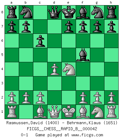 Last move : 0-1 2007 April 24 6:35:24 [Event "FICGS__CHESS__RAPID_B__000042"] [Site "FICGS"] [Date "2007.03.16"] [Round "1"] [White "Rasmussen,David"] [Black "Behrmann,Klaus"] [Result "0-1"] [WhiteElo "1400"] [BlackElo "1651"] 1.e4 c6 2.d4 d5 3.Nc3 dxe4 4.Nxe4 Bf5 0-1 This chess game has been lost on time (started : 2007.03.16 20:49:37) Caro-Kann : Classical variation Player Black won this chess game. Follow this game move after move (download)There are two classes of men; those who are content to yield to circumstances and who play whist; those who aim to control circumstances, and who play Chess. (Mortimer Collins) Oft bringt ein stiller Zug das Erdbeben. (Richard Reti) Todo se encuentra en un estado de flujo y esto incluye al mundo del Ajedrez. (Mikhail Botvinnik) Je ne suis pas le dernier à jouer lâchement des coups douteux pendant le zeïtnot de l'adversaire pour l'achever: en effet les coups qui font le plus peur sont ceux que l'on ne comprend pas. Je me fais souvent peur quand je joue. (Un professeur anonyme) Life is like a ten-speed bicycle: most of us have gears we never use. (Charles M. Schulz)