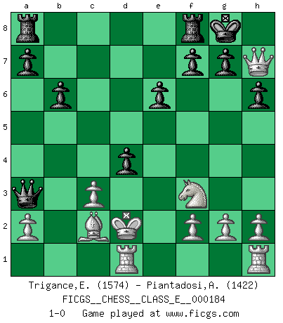 Last move : 1-0 2015 December 26 22:17:23 [Event "FICGS__CHESS__CLASS_E__000184"] [Site "FICGS"] [Date "2015.11.26"] [Round "1"] [White "Trigance,Emile"] [Black "Piantadosi,Angelo"] [Result "1-0"] [WhiteElo "1574"] [BlackElo "1422"] 1.e4 e6 2.d4 d5 3.Nc3 dxe4 4.Nxe4 Nd7 5.Nf3 Ngf6 6.Nxf6+ Nxf6 7.Bd3 Be7 8.Bg5 h6 9.Bh4 O-O 10.Qe2 b6 11.O-O-O Bb7 12.c3 Nd5 13.Bxe7 Qxe7 14.Qe4 Nf6 15.Qxb7 Nd5 16.Bc2 Nxc3 17.bxc3 Qa3+ 18.Kd2 c5 19.Qe4 cxd4 20.Qh7+ 1-0 French : Rubinstein variation Kingside Castling by player Black (move 9) Queenside Castling by player White (move 11) Player White won this chess game. Follow this game move after move (download)Do you realize Fischer almost never has any bad pieces? He exchanges them, and the bad pieces remain with his opponents. (Yuri Balashov) Obwohl ich alt bin, darf mir niemand den Finger in den Mund stecken, sonst beisse ich. (Wilhelm Steinitz) Todavía soy una víctima del Ajedrez. Tiene toda la belleza del arte y mucho mas. No puede ser comercializado. El Ajedrez es mas puro que el arte en su posición social. (Marcel Duchamp) Toutes choses étant égales, c'est la conviction qui gagne. Alliée à une volonté de vaincre, elle sert de détonateur, suscite des idées, disperse les doutes et aide à penser clairement. (Robert Fischer) Beep ! (R2D2 in Star Wars ep.3)