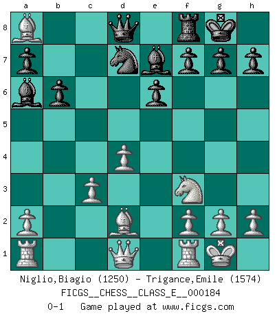 Last move : 0-1 2016 February 8 14:0:46 [Event "FICGS__CHESS__CLASS_E__000184"] [Site "FICGS"] [Date "2015.11.26"] [Round "1"] [White "Niglio,Biagio"] [Black "Trigance,Emile"] [Result "0-1"] [WhiteElo "1250"] [BlackElo "1574"] 1.e4 c6 2.d4 d5 3.exd5 cxd5 4.c4 Nf6 5.Nc3 e6 6.Nf3 Bb4 7.cxd5 Nxd5 8.Bd2 O-O 9.Bd3 b6 10.O-O Nxc3 11.bxc3 Be7 12.Be4 Nd7 13.Bxa8 Ba6 0-1 Caro-Kann : Panov-Botvinnik attack, 5...e6 Kingside Castling by player Black (move 8) Kingside Castling by player White (move 10) Player Black won this chess game. Follow this game move after move (download)The battle for the ultimate truth will never be won. And that's why Chess is so fascinating. (Hans Kmoch) Um dein Spiel zu verbessern musst du zuallererst das Endspiel studieren, denn diese kann unabhängig studiert werden. Die Eröffnung und das Mittelspiel müssen immer in Bezug gesetzt werden zum Endspiel. (José Raúl Capablanca) El Ajedrez, como la música, como el amor, tiene el poder de hacer feliz a la gente. (Siegbert Tarrasch) Un millionnaire : 'Monsieur Steinitz ! Vous ne participez aux tournois que pour l'argent, alors que moi je n'y viens que pour l'honneur.' Steinitz : 'Chacun joue pour ce qu'il n'a pas'... It's not a bug - it's an undocumented feature. (Anonymous)