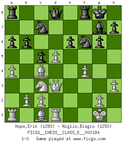 Last move : 1-0 2016 February 8 1:59:55 [Event "FICGS__CHESS__CLASS_E__000184"] [Site "FICGS"] [Date "2015.11.26"] [Round "1"] [White "Hops,Erik"] [Black "Niglio,Biagio"] [Result "1-0"] [WhiteElo "1283"] [BlackElo "1250"] 1.e4 d6 2.d4 Nf6 3.Nc3 g6 4.f4 Bg7 5.Nf3 O-O 6.Bd3 Na6 7.O-O c5 8.d5 Bg4 9.Bc4 Nc7 10.h3 Bxf3 11.Qxf3 a6 12.a4 b6 13.Qd3 e6 14.dxe6 fxe6 15.Rd1 d5 16.exd5 1-0 Pirc : Austrian attack, 6.Bd3 Kingside Castling by player Black (move 5) Kingside Castling by player White (move 7) Player White won this chess game. Follow this game move after move (download)There are two types of sacrifices: correct ones and mine. (Mikhail Tal) Wenn ich gewinne bin ich ein Genie. Wenn nicht, dann bin ich keines. (Robert James Fischer) Todo lo que importa ante el tablero de Ajedrez son buenas jugadas. (Bobby Fischer) Le jeu d'échecs fait naître et fortifie en nous plusieurs qualités précieuses dans le cours de l'existence, telles que la prévoyance, la circonspection, la prudence, et la persévérance. (Benjamin Franklin - 1783, la morale des échecs) Philosophers use a language that is already deformed as though by shoes that are too tight. (Ludwig Wittgenstein)