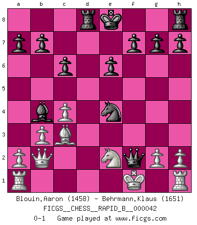 Last move : 0-1 2007 April 4 19:1:2 [Event "FICGS__CHESS__RAPID_B__000042"] [Site "FICGS"] [Date "2007.03.16"] [Round "1"] [White "Blouin,Aaron"] [Black "Behrmann,Klaus"] [Result "0-1"] [WhiteElo "1458"] [BlackElo "1651"] 1.e4 c6 2.Nc3 d5 3.d4 dxe4 4.Nxe4 Bf5 5.Bd3 Qxd4 6.f3 e6 7.Ne2 Qb6 8.b3 Nd7 9.Bb2 Bxe4 10.Bxe4 Rd8 11.c4 Bb4+ 12.Bc3 Nc5 13.Qc1 Nxe4 14.fxe4 Nf6 15.Qb2 Nxe4 16.Kf1 Qf2+ 0-1 Caro-Kann defense Player Black won this chess game. Follow this game move after move (download)All that matters on the Chessboard is good moves. (Bobby Fischer) Das Schach hält seine Meister in eigenen Banden, Fesseln; auf vielerlei Weise formt es ihren Geist, so dass die innere Freiheit selbst des Stärksten beeinflusst wird. (Albert Einstein) Aquel que ve no otra dirección en el juego que la de dar Jaque Mate a su oponente, nunca será un buen jugador de Ajedrez. (Euwe) Le plus grand jeu de l'esprit jamais inventé, plus vous l'apprenez, plus vous y prenez du plaisir. (Garry Kasparov) A good player is always lucky. (Capablanca)