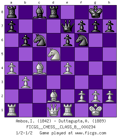 Last move : 1/2-1/2 2015 December 6 7:23:28 [Event "FICGS__CHESS__CLASS_B__000234"] [Site "FICGS"] [Date "2015.11.27"] [Round "1"] [White "Ambos,Ilmar"] [Black "Duttagupta,Aniruddha"] [Result "1/2-1/2"] [WhiteElo "1842"] [BlackElo "1889"] 1.d4 d5 2.c4 c6 3.Nf3 Nf6 4.Nc3 e6 5.a4 Bb4 6.Bg5 dxc4 7.e4 Qa5 8.Bd2 c5 9.Bxc4 cxd4 10.Nxd4 O-O 11.Nc2 Nc6 12.Nxb4 Qxb4 13.b3 Rd8 14.O-O Qe7 15.Re1 b6 16.Nd5 1/2-1/2 QGD Slav : 4.Nc3 Kingside Castling by player Black (move 10) Kingside Castling by player White (move 14) This chess game ended in a draw. Follow this game move after move (download)My style is somewhere between that of Tal and Petrosian. (Reshevsky) Alle Schachspieler sollten auch ein Hobby haben. (Savielly Grigorievitsch Tartakower) Cuando tu casa esta en llamas, no puedes ser molestado por tus vecinos. O, como decinos en Ajedrez, si tu Rey esta bajo ataque, no te preocupa perder un Peón del lado de la Reina. (Gary Kasparov) Les ravages du H expliquent la différence de niveau entre Tal et Thal [Abergel]. I'm extremely disappointed. I send you out for exciting, new designer drugs, you come back with tomato sauce. (Gregory House, House M.D.)