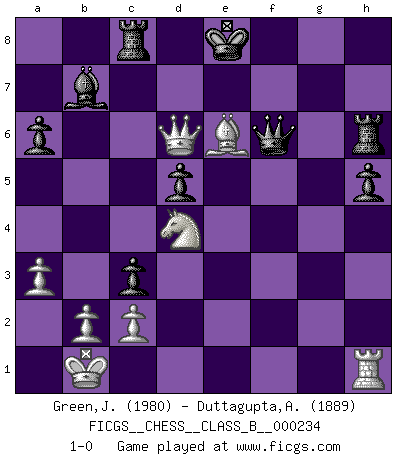 Last move : 1-0 2016 January 12 6:4:33 [Event "FICGS__CHESS__CLASS_B__000234"] [Site "FICGS"] [Date "2015.11.27"] [Round "1"] [White "Green,Jonathan"] [Black "Duttagupta,Aniruddha"] [Result "1-0"] [WhiteElo "1980"] [BlackElo "1889"] 1.e4 c5 2.Nf3 d6 3.d4 cxd4 4.Nxd4 Nf6 5.Nc3 a6 6.Be3 e6 7.Qd2 b5 8.a3 Bb7 9.f3 Nbd7 10.g4 h6 11.O-O-O Rc8 12.h4 Nb6 13.Kb1 d5 14.g5 hxg5 15.e5 Nfd7 16.Bxg5 Be7 17.Bxe7 Qxe7 18.f4 g6 19.h5 gxh5 20.f5 Nxe5 21.fxe6 fxe6 22.Bh3 Nbc4 23.Qh2 b4 24.Rde1 Rh6 25.Rxe5 Nxe5 26.Qxe5 bxc3 27.Bxe6 Qf6 28.Qd6 1-0 Sicilian : Najdorf, Byrne (English) attack Queenside Castling by player White (move 11) Player White won this chess game. Follow this game move after move (download)Chess is imagination. (David Bronstein) Fischer: 'Remis!?' Uhlmann: 'Aber es muss doch dreimal Zugwiederholung sein!' Fischer: 'Sie nehmen das Remis an, wie ich es sage, sonst spiele ich weiter und werde Sie dann schlagen!' (Robert James Fischer) Las leyes del Ajedrez no permiten una libre elección: tienes que mover quieras o no. (Emanuel Lasker) Une platitude souvent récitée à propos des Echecs est qu'une des choses les plus difficiles à réaliser est de gagner une position gagnante. Cela ne manque pas de sens mais, pour ma part, j'ai toujours trouvé plus difficile de gagner une position perdante. (Tim Krabbe) Patience, use the Force, think ! (Obi-Wan Kenobi in Star Wars ep.2)